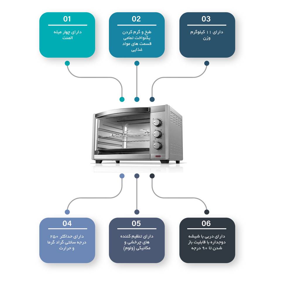 • امکان حرارت دهی در سه حالت بالا، پایین و هردو به‌صورت همزمان
