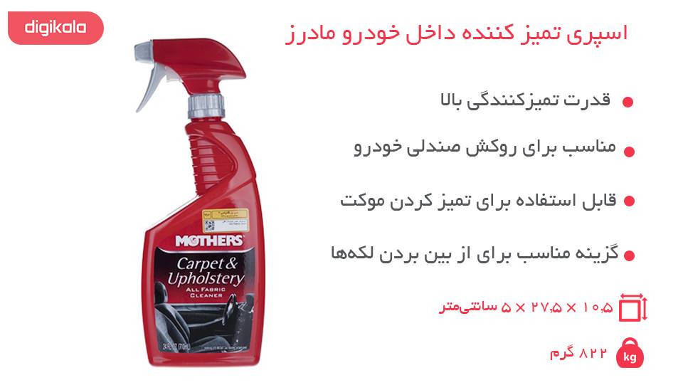 اسپری فوق یکی از تولیدات شرکت «مادرز» (Mothers) است که برای تمیز کردن سطوح داخلی خودرو (بخش‌های موکتی و روکش‌های صندلی) مورد استفاده قرار می‌گیرد. این محصول که مدل «5424» نام دارد دارای ساختاری ویژه است. این ساختار در زدودن آلودگی‌ها کمک زیادی می‌کند. ازبین بردن لکه‌های چربی و بسیار کثیف کار اصلی این اسپری است. این اسپری کمترین میزان واکنش را با روکش و قسمت‌های وینیلی خودرو می‌دهد. با کمک این محصول دیگر نیازی نیست که روکش‌ها را تنها به‌خاطر لکه‌ها و بخش‌هایی کثیف بشویید و طول عمر آن‌ها را کوتاه کنید. محصول فوق در احیای رنگ‌ها نیز عملکردی مناسب دارد. افشانه‌ای بودن این محصول مزیت خوبی است که در هنگام تمیزکردن قسمت‌های عمیق و دور از دسترس کابین خودرو خود را نشان می‌دهد. نه‌تنها از این محصول می‌توانید برای تمیزکردن قسمت‌های مخملی و موکتی  داخل خودرو استفاده کرد بلکه گزینه‌ای مناسب برای فرش، موکت و دیگر لوازم پارچه‌ای خانه محسوب می‌شود. این محصول حجمی برابر 710 میلی‌لیتر دارد و باتوجه به ویژگی‎‌های بیان‌شده برای آن، موجود بودن این اسپری در خانه و در خودرو بسیار مفید و سودمند خواهد بود.