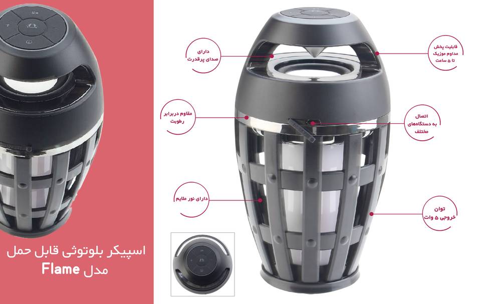اسپیکرهای بلوتوثی یک وسیله جالب و سرگرمکننده همراه شما هستند. باوجود باتری داخلی قابل شارژ و تکنولوژی بلوتوث، شما میتوانید با این اسپیکرها در همهجا موزیک گوش دهید بدون اینکه به برق نیاز داشته باشید. با اتصال گوشی موبایل، تبلت، لپتاپ و دیگر وسایل دیجیتالی به این اسپیکر میتوانید در مجالس، دورهمیها و مسافرت از صوت موزیک بهرهمند شوید. اسپیکر بلوتوثی قابلحمل مدل Flame دارای ظاهری خلاقانه و زیبا و بهشکل یک چراغ است. دراین دستگاه از بلوتوث نسخه 4.2 استفادهشده که میتوانید هر دستگاهی که به بلوتوث مجهز است را بهآن متصل کنید. قطر بلندگوی بهکاررفته در آن 95 میلیمتر و توان خروجی آن 5 وات است. این اسپیکر دارای باتری لیتیومیونی باظرفیت 3800 میلیآمپرساعت است و تا 5 ساعت قادراست شارژدهی داشته باشد. همچنین مدتزمان مورد نیاز برای شارژ باتری این دستگاه نیز 3 ساعت است. این اسپیکر دارای گواهینامه IP65 که آنرا دربرابر گردوغبار و رطوبت مقاوم کرده است. اسپیکر بلوتوثی قابلحمل مدل Flame دارای نور ملایم، دو عدد باتری و صدای پرقدرت است و بهاکثر دستگاهها مانند آیفون، ویندوز و اندروید متصل میشود.