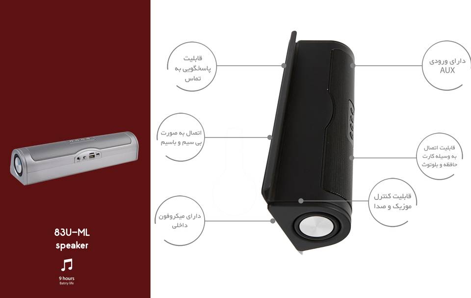 گوشدادن به موسیقی در بخش زیادی از روز حتی در هنگام انجام کارهای دیگر همراه ماست و این باعث میشود استفاده از اسپیکری با کیفیت بالا و اندازهای که راحت قابل حمل باشد بسیار مهم شود. اسپيکر پرتابل مدل ML-83Uاز سری اسپیکرهای بلوتوثی با طراحی اسپرت است. این اسپیکر دارای فضایی مناسب برای قرارگیری تبلت و موبایل بهصورت استند است که کارکردن همزمان با گوشی و اسپیکر را بسیار آسان میکند. اين اسپيکر از طريق بلوتوث با ورژن 4.2 به دستگاه و هدفون مورد نظر شما متصل ميشود و تا 10 متر برد دارد. اسپيکر«ML-83U» علاوه بر فناوري بلوتوث، داراي شيار کارت حافظه، ورودي جک 3.5 ميليمتري و USB نيز هست. يک پورت MicroUSB جهت شارژ اسپيکر روي دستگاه قرار دارد. وجود ميکروفون در اين محصول به شما اين امکان را ميدهد تا از طريق اسپيکر به سادگي تماسهاي دريافتي و يا خروجي خود را پاسخ دهيد. روي اين اسپيکر دکمههایي تعبيه شده که میتوانيد بهوسيله آنها کنترل آهنگهاي خود را داشته باشيد و دستگاه را خاموش روشن کنید. همچنین در زیر اسپیکر دو تکه استپگیر لاستیکی تعبیه شده است که از حرکت اسپیکر در هنگان پخش موزیک بهخوبی جلوگیری میکند.