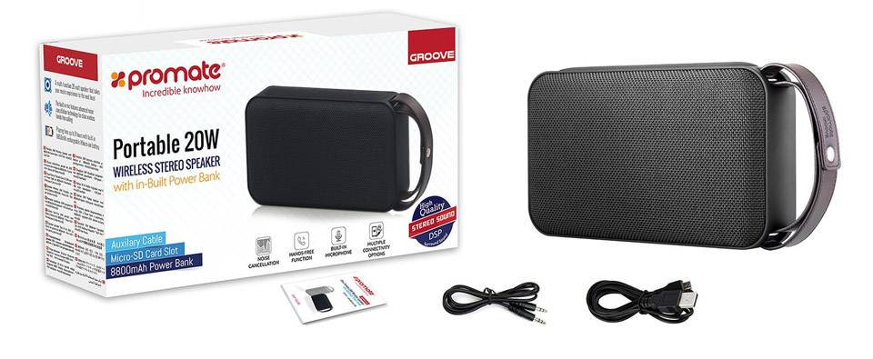 اسپیکر Groove از ورودی‌های متنوعی برخوردار است. این دستگاه با داشتن میکروفون داخلی و امکان از بین بردن صدای مزاحم (Noise Cancelation)، امکان مدیریت تماس را برای کاربر فراهم می‌کند. توان خروجی اسپیکر یکی از ملاک‌های سطح خروجی صدای اسپیکر است. خروجی صدای 20 واتی Groove نیز حاکی از قدرت زیاد این اسپیکر در تولید صدا است. پس کیفیت صدای مطلوبی را از این اسپیکر دریافت خواهید کرد. نکته جالب در خصوص این محصول شرکت پرومیت این است که می‌توانید از این اسپیکر به‌عنوان پاوربانک استفاده کنید و با آن باتری گوشی همراه خود را هم شارژ کنید.