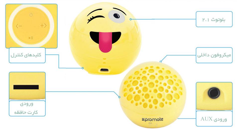 اسپیکر Groovoji پرومیت برای کاربران شبکههای اجتماعی ظاهری آشنا دارد. این ظاهر فانتزی یکی از صورتکهای محبوبی است که در اکثر پیامرسانها بهصورت به کار گرفته شده و بسیار محبوب است. جمعوجور بودن از ویژگیهای مهم محصولات حمل شدنی است. ابعاد بسیار کوچک این اسپیکر را میتوان یکی از نقاط قوت آن دانست. به دلیل ابعاد کوچکی این اسپیکر دارد میتوانید آن را درون کیف یا حتی جیبهای بزرگ خود جای دهید و همیشه آن را با خود به همراه داشته باشید. این اسپیکر جمعوجور از ورودیهای متنوعی برخوردار است و با داشتن میکروفون داخلی و امکان مدیریت تماسها ارزش خرید بالایی دارد. توانایی تأمین انرژی موردنیاز برای پخش مداوم 3 ساعت موسیقی شاید در نگاه اول چندان قابلتوجه به نظر نرسد اما توجه داشته باشید که این میزان از پخش موسیقی از طریق باتری کوچکی انجام میشود که در دل Groovoji جای گرفته است؛ بنابراین، چنین عمر باتری برای اسپیکری با این ابعاد کم تلقی نمیشود. توان خروجی این محصول نیز 3 وات است که میزان متوسطی برای یک اسپیکر حمل شدنی محسوب میشود. بنابراین، اگر به دنبال اسپیکری با توان خروجی زیاد هستید بهتر است به محصولات گرانتر فکر کنید اما اگر میخواهید اسپیکری مقرونبهصرفه با ورودیهای متنوع و امکان مدیریت صدا داشته باشید میتوانید این اسپیکر را بهعنوان یکی از انتخابهای خود در نظر بگیرد.