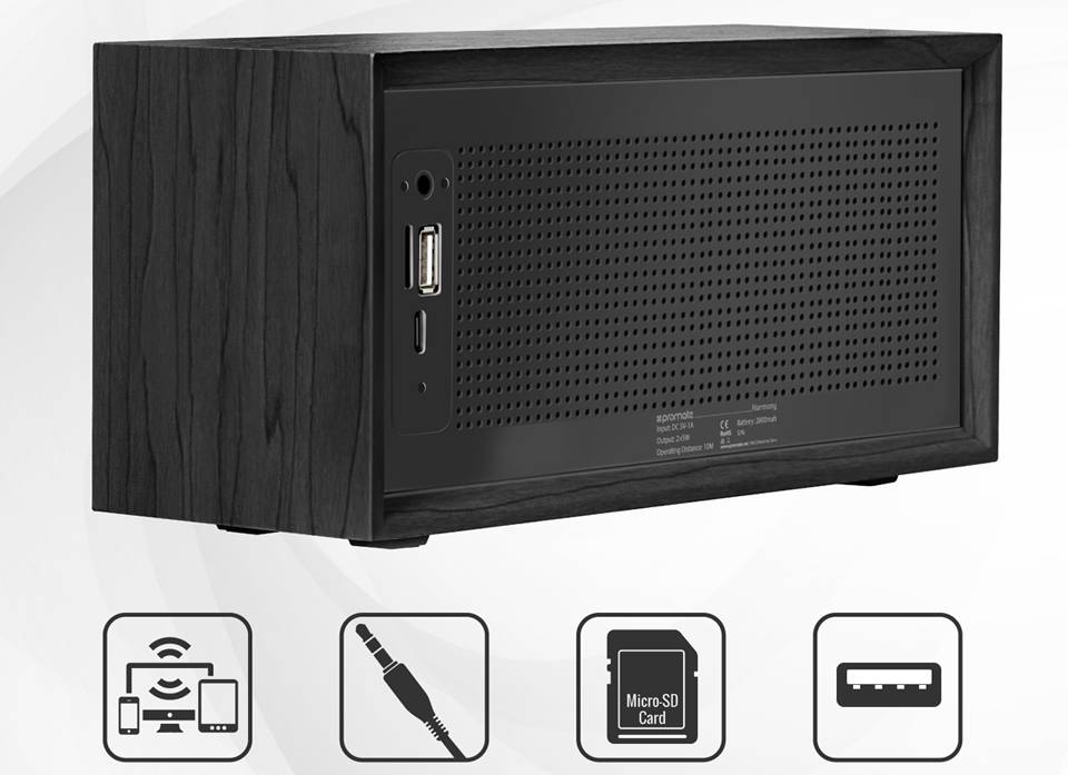 اسپیکر «Harmony» از سری تولیدات شرکت پرومیت ظاهری کلاسیک دارد. این اسپیکر به شکل مستطیل تولید شده است تا بتوانید آن را روی هر سطح صافی قرار دهید. این محصول دارای دو درایور صوتی است که مجموعاً قادرند خروجی صدای 10 وات را به اطراف انتشار دهند. ضلع پشتی این محصول میزبان درگاههای ورودی آن است و دیگر پنل کنترل آن در قسمت جلویی اسپیکر جای گرفته است. درست است که به دلیل ابعاد جمعوجور این اسپیکر در رده محصولات قابل حمل جای میگیرد اما در آن خبری از بندآویز نیست.