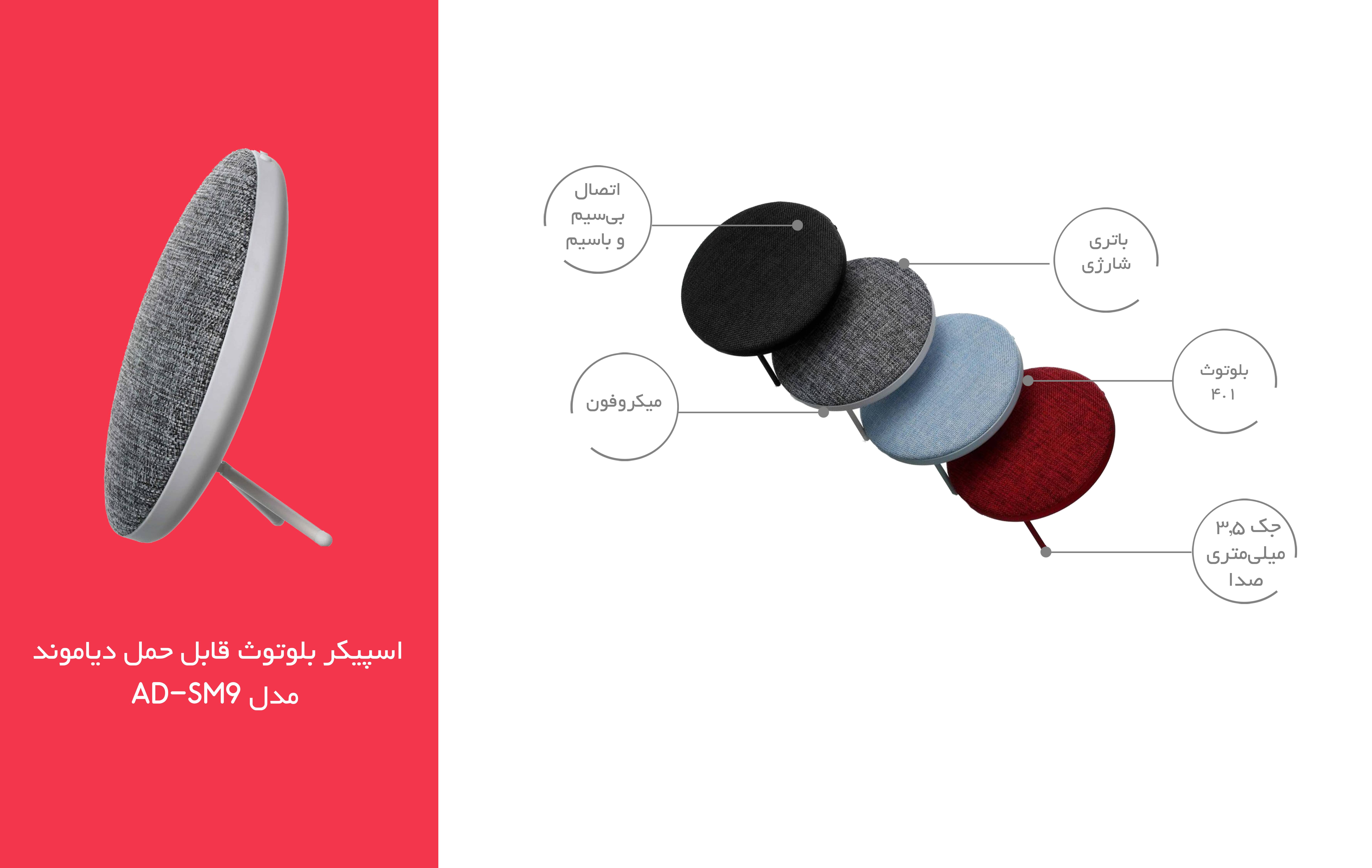 اسپیکر قابل حمل دیاموند مدل AD-SM9 یک اسپیکر قابل حمل بلوتوثی است. این محصول مجهز به یک باتری 1800 میلی‌آمپری است که 6 ساعت توانایی پخش مداوم موسیقی دارد. میکروفن تعبیه شده برای این اسپیکر امکان برقراری تماس تلفنی را هم فراهم کرده است. این اسپیکر از طریق بلوتوث نسخه 4.1 به پخش کننده متصل می‌شود و تا مسافت 10 متر را به راحتی پوشش می‌دهد. AD-SM9 با همه تلفن‌های هوشمند مجهز به سیستم عامل اندروید و iOS سازگاری دارد. کلیدهای کنترل دستگاه شامل تعویض موزیک و روشن و خاموش کردن دستگاه می‌شود که روی دستگاه تعبیه شده است و در سمت چپ یک پورت Micro USB برای شارژ و جک 3.5 میلی‌متری برای اتصال از طریق سیم(AUX) طراحی شده است. همراه با اسپیکر بلوتوث قابل حمل دیاموند مدل AD-SM9 کابل شارژ میکرو یو اس بی و کابل AUXموجود است. گفتنی است که این اسپیکر بلوتوثی وزن سبکی دارد.