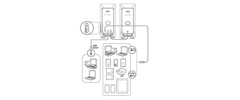 برای اتصال مانیتور SBS A50 به کامپیوتر تنها کافی است که از جک 3.5 ارائه شده بهره برد. این جک باعث شده که کاربر به راحتی بتواند در سریعترین زمان ممکن اسپیکر را به کامپیوتر خود متصل کند. علاوهبراین به کمک جک 3.5 میلیمتری میتوان اسپیکر SBS A50 را به راحتی به تلفنهمراه، تبلت یا پخش کنندهی موسیقی دارای درگاه 3.5 میلیمتری متصل کرد. اسپیکر SBS A50 انرژی خود را از طریق درگاه USB کامپیوتر یا پاوربانک تامین میکند. شرکت کریتیو در کنار درگاه 3.5 میلیمتری صدای این اسپیکر یک درگاه USB برای تامین انرژی اسپیکر در نظر گرفته است. کابل USB و کابل انتقال اطلاعات در این محصول طول مناسبی دارد و این موضوع باعث شده که بتوان بدون هیچگونه دردسری بتوان از آن روی میزکار خود استفاده کرد.