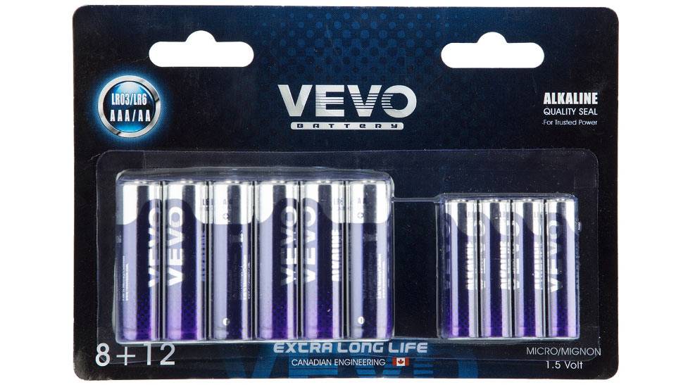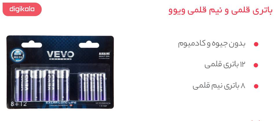 محصول فوق 20 عدد از باتری‌های Vevo بوده که شامل 12 عدد باتری قلمی (AA) و 8 عدد باتری نیم قلمی (AAA) است. این باتری‌ها بسیار پراستفاده بوده و حتی اگر در حال حاضر نیازی به آن‌ها نداشته باشید به احتمال زیاد در آینده‌ای نزدیک باتری کنترل تلویزیون، ساعت و موارد دیگر از این قبیل در منزل تمام خواهد شد و این باتری‌های 1.5 ولتی مورد استفاده شما قرار می‌گیرد. با توجه به قیمت محصول، انتخاب باتری‌های آلکالاین خریدی مناسب و ایدئال است.
