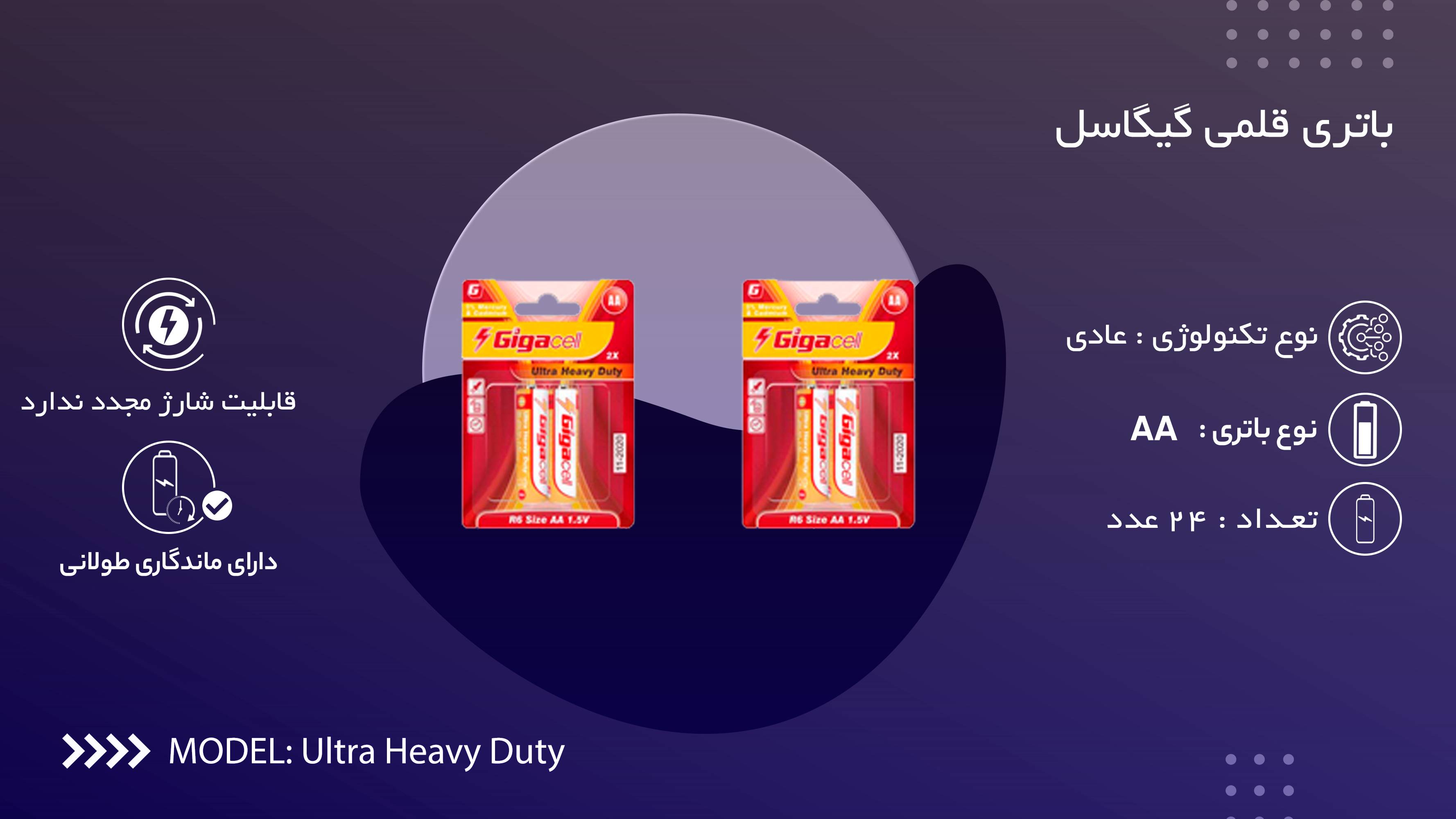 مشخصات فنی مشخصات باتریتعداد باتری های موجود در پک 24 عدد نوع باتری AA ولتاژ باتری 1.5 ولت نوع تکنولوژی باتری عادی قابلیت شارژ مجدد ندارد ماندگاری طولانی دارد
