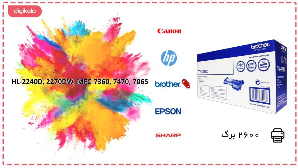 مدل «TN-2280» از سری تونرهای باکیفیت شرکت «برادر» (Brother) است. این محصول برای پرینترهای شرکت برادر طراحی شده و عملکرد خوبی از خود نشان می‌دهد. تونر TN-2280 نسبت به مدل‌های مشابه، بادوام‌تر و قابل اعتمادتر است. این دستگاه می‌تواند تا 2600 برگ به چاپ برساند. فارغ از ظرفیت، اسناد با نهایت کیفیت چاپ می‌شوند. مدل TN-2280 با پرینترهای HL-2240D, 2270DW, MFC-7360, 7470, 7065 سازگار است. برای جلوگیری از کاهش طول عمر پرینتر و رسیدن به کیفیت ایدئال، پیشنهاد می‌شود از تونرهای اصل استفاده کنید.