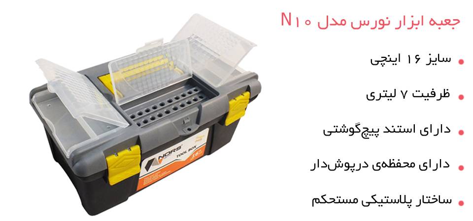 محصول فوق یکی از تولیدات شرکت «نورس» (Nors) بوده که برای نگهداری و حمل ابزارهای کوچک مناسب است. این جعبهابزار از پلاستیک سخت و فشرده تولید شده است. استفاده از پلاستیک موجب کاهش وزن این محصول شده؛ در نتیجه پس از قراردادن ابزارها درون آن وزن جعبه بیش از حد بالا نمیرود. این جعبه ابزار از 8 محفظه تشکیل شده است. وجود این 8 محفظه به کاربر امکان میدهد تا بتواند ابزارهای خود را تفکیک کرده و با نظم بیشتری درون جعبهابزار قرار دهد. یکی از مزایای این محصول وجود محفظههایی درپوشدار روی جعبه است. این محفظههای کوچک برای نگهداری از ابزارهای کوچکتر مانند پیچ و مهره، رولپلاک، میخ، چسب و واشر مناسب هستند. یکی از ویژگیهای جالب این محصول وجود محلی برای قراردادن پیچگوشتی و فازمتر است. جعبهابزار مدل N10 دارای یک دسته و دو چفت پلاستیکی بوده و ظرفیتی 7 لیتری دارد.