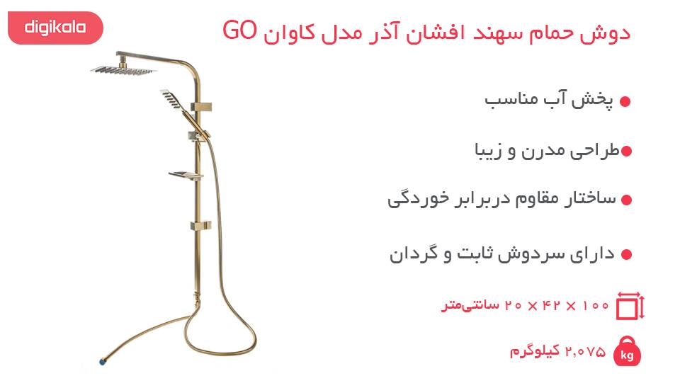 محصول فوق یکی از تولیدات زیبای شرکت «سهند افشان آذر» (Sahand Afshan Azar) است که برای حمام تولید می‌شود. این محصول رنگی طلایی داشته و استفاده از آن در حمام، ظاهری لوکس به آن خواهد بخشید. این دوش حمام تحت عنوان مدل «کاوان GO» به بازار عرضه می‌شود. از آنجایی که دوش حمام در شرایط مرطوب قرار دارد ساختار آن باید به گونه‌ای باشد که با گذشت زمان دچار خوردگی و زنگ‌زدگی نشود. خوشبختانه در این محصول به لطف وجود استیل و پلاستیک، دوش مقاومت بالایی دربرابر خوردگی و زنگ‌زدگی پیدا کرده است. برای جلای بیشتر و بالا بردن مقاومت دوش نیز از روکش براق نیکل کروم استفاده شده است. این محصول دارای دو سردوش ثابت و گردان است که طول شلنگ بلند 145 سانتی‌متر بوده و شلنگ کوتاهتر 45 سانتی‌متر است. از دیگر مزایای این محصول می‌توان به وجود جاصابونی روی آن اشاره کرد.