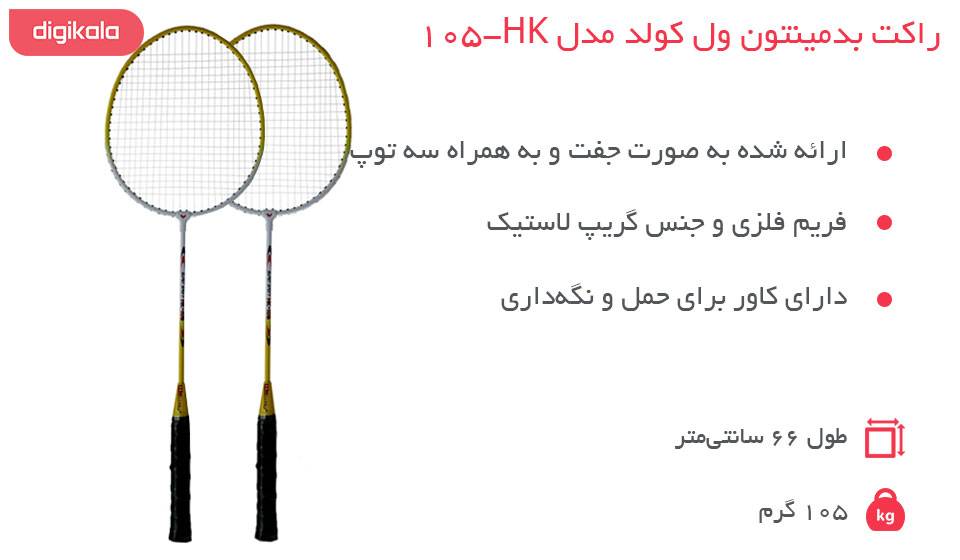 بدمینتون از آن دسته بازیهای است که به فضای خاصی نیاز ندارد و تنها باید راکت و توپ آن را فراهم کرد. راکت بدمینتون «ول کولد» مدل «HK-105» در یک بسته 2 عددی عرضه شده است و میتواند گزینهی خوبی برای پر کردن اوقات فراغت با ورزش جذاب بدمینتون باشد. در تصویر ذیل مشخصات اصلی این محصول قابل مشاهده است.