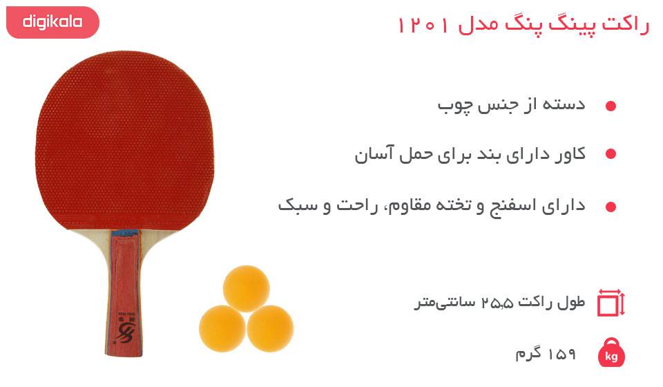 راکت پینگ‌پنگ مدل «1201» در بسته‌بندی دوعددی به همراه سه عدد توپ عرضه می‌شود تا به‌راحتی با دوستان و آشنایان خود، امکان بازی‌کردن داشته باشید. دسته‌ی راکت‌ها از جنس چوب است و مقاومت و استحکام مناسبی دارد. راکت‌ها دارای روکش اسفنجی هستند تا علاوه‌بر افزایش مقاومت، هنگام برخورد توپ، مدت‌زمان بیشتری برای جداشدن توپ از راکت صرف شده؛ درنتیجه با کنترل بیشتری ضربه زده شود. از دیگر ویژگی‌های جالب این محصول، داشتن یک کاور به‌منظور حمل آسان است؛ به‌این‌ترتیب با قراردادن راکت‌ها و توپ‌ها داخل کاور به‌سادگی قادر هستید آن‌ها را داخل کیف و کوله‌پشتی قرار دهید. با وجود سه توپی که همراه این محصول عرضه می‌شود، می‌توانید در سفر، پیک‌نیک و... از ورزش مفرح و پرتحرک پینگ‌پنگ در کنار عزیزانتان بیشتر از همیشه لذت ببرید.