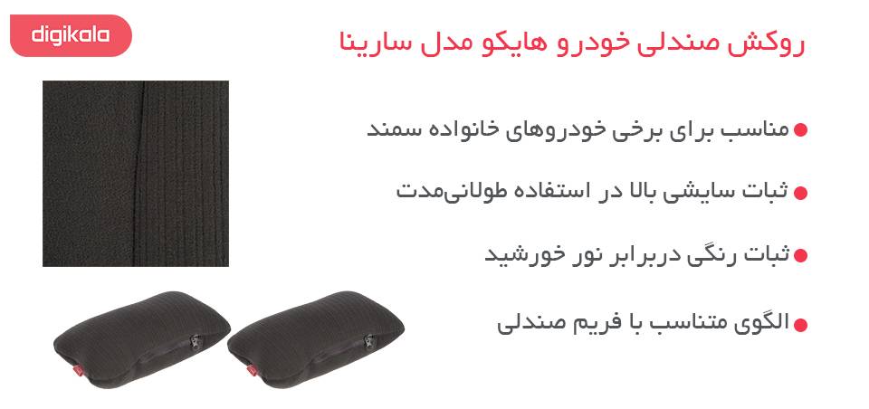 محصول فوق یکی از روکش‌های صندلی طراحی و تولید شده توسط شرکت «هایکو» (Hyco) است. این روکش تحت عنوان مدل «سارینا» (Sarina) به بازار عرضه می‌شود. شرکت هایکو در طراحی این روکش صندلی خودرو بسیار دقیق عمل کرده است و از مواد باکیفیت و مرغوبی برای تولید آن استفاده کرده است. این محصول دربرابر تابش نور خورشید مقاومت بالایی دارد و دچار تغییر رنگ نمی‌شود، ازسویی دیگر مقاومت آن دربرابر لکه‌پذیری، سایش و گسترش آتش مزایای دیگری هستند که می‌توان آن‌ها را نام برد. در قسمت پشتی این روکش یک جیب قرار دارد که می‌توان از آن برای نگه‌داری لوازم کوچک استفاده کرد. از این روکش می‌توان برای خودروهای سمند LX و سورن تولیدی سال 96 به بعد استفاده کرد که از زیرسری‌های جلو و عقب مستطیلی‌شکل برخوردارند. روکش صندلی مدل سارینا قابلیت شست‌وشو داشته و به‌راحتی و بدون نگرانی از خراب شدن می‌توانید آن را بشووید و مجددا مورد استفاده قرار دهید.