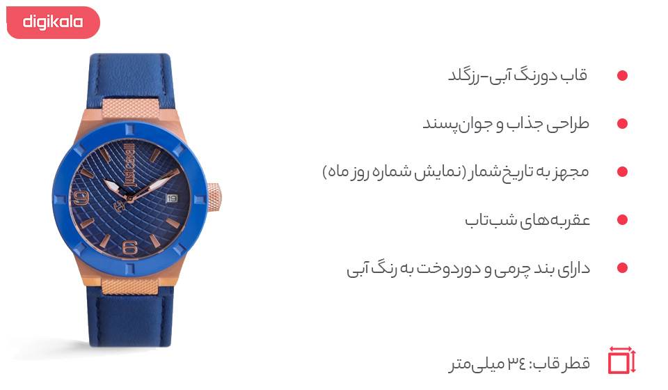 ساعت مدل «JC1L017L0035» از برند «جاست کاوالی» (Just Cavalli) ساعتی زنانه و از نوع مچی عقربهای است. ساعت زنانهی جاست کاوالی صفحهای آبی رنگ و طرحدار دارد. قطر تقریبی قاب جاست کاوالی 34 میلیمتر و ضخامت ساعت 10 میلیمتر است. فرم صفحه گرد و بدنهی آن از جنس استیل ضدزنگ و به رنگ رزگلد است. همچنین تاج ساعت، نشانگرها و بدنه هم به رنگ رزگلد است. بزل ساعت به رنگ آبی است که با رنگ صفحه و همینطور بند هماهنگی دارد. عقربههای ساعت جاست کاوالی از نوع شبتاب هستند. روی صفحهی ساعت یک نمایشگر تاریخ به چشم میخورد که شمارهی روز ماه را نمایش میدهد. تکنولوژی ساخت ساعت مدل JC1L017L0035 الکترونیکی است و با توجه به طراحی ظاهریاش برای استفادهی روزمره بسیار مناسب است. بند چرمی و آبی رنگ جاست کاوالی به زیبایی بیشتر ساعت کمک فراوانی کرده است. بند با قفل سگکی ساده و فلزی به آسانی باز و بسته میشود. ساعت زنانهی مدل JC1L017L0035 تا فشار 5 بار، قادر به مقاومت در برابر نفوذ آب است. منبع انرژی ساعت جاست کاوالی باتری است. ساعت شیک، زیبا و زنانهی مدل JC1L017L0035 از برند جاست کاوالی گزینهای مناسب برای بانوان خوشسلیقه است.