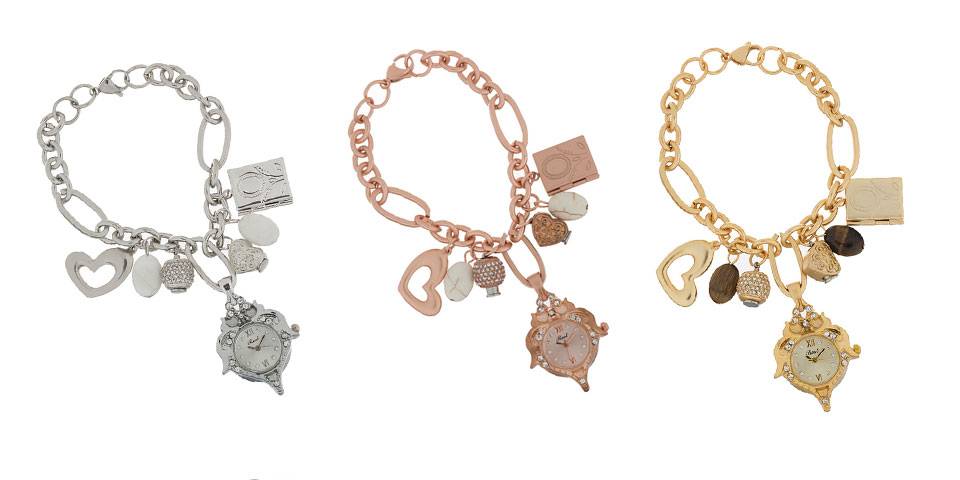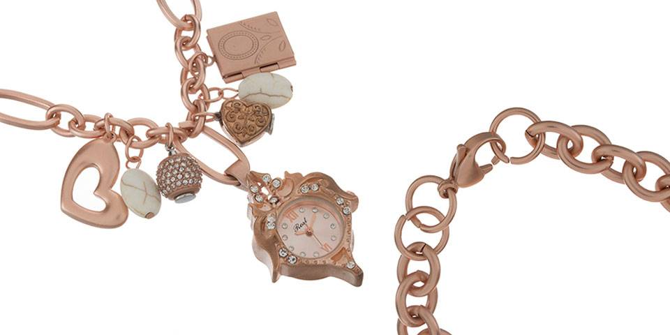 بند ساعت زنانهی رست که مانند زنجیری با حلقههای درشت است همانند بدنهی ساعت فلزی بوده و آویزهایی از جنس سنگ و فلز به آن متصل شده است. دو عدد از آویزهای متصل به بند به شکل قلب هستند که یکی از قلبها توخالی و ظریف و قلب دیگر به صورت توپر است و ابعاد قلب توپر کوچکتر از قلب توخالی است. آویزی نگیندار هم به زنجیر ساعت دستبندی متصل شده است. به جز آویزهایی به آنها اشاره شد، یک آویز قاب عکس بسیار کوچک و مستطیل شکل هم به چشم میخورد. قاب عکس آویز ابعادی معادل 2 × 1.5 سانتیمتر دارد که دو عکس کوچک در آن قرار میگیرد و شما میتوانید تصویر دو تن از عزیزانتان را همیشه با خود به همراه داشته باشید. سنگهای آویز در هر رنگ ساعت طرح و رنگ متفاوتی دارد. سنگهای به کار برده شده در ساعت نقرهای و رزگلد به رنگ سفید و بیضی شکل هستند. سنگهای استفاده شده در دستبند طلایی رنگ ازنوع چشم ببر و به رنگ قهوهای هستند. بند ساعت دستبندی رست به وسیلهی قفلی فلزی و ساده که در ساخت دستبند به کار میرود، به آسانی باز و بسته میشود. قفل در هر ساعت رنگی مطابق با زنجیر و آویزها دارد. بدنهی ساعت با حلقهای درشت به زنجیر آویزان شده و در وسط قرار گرفته است و آویزهای دیگر در دو سمت ساعت قرار گرفتهاند. در ساعت دستبندی و زنانهی رست 6 آویز مجزا قرار دارد که در دو سمت ساعت قرار گرفتهاند و همگی در قسمت جلوی مج دست قرار میگیرند.