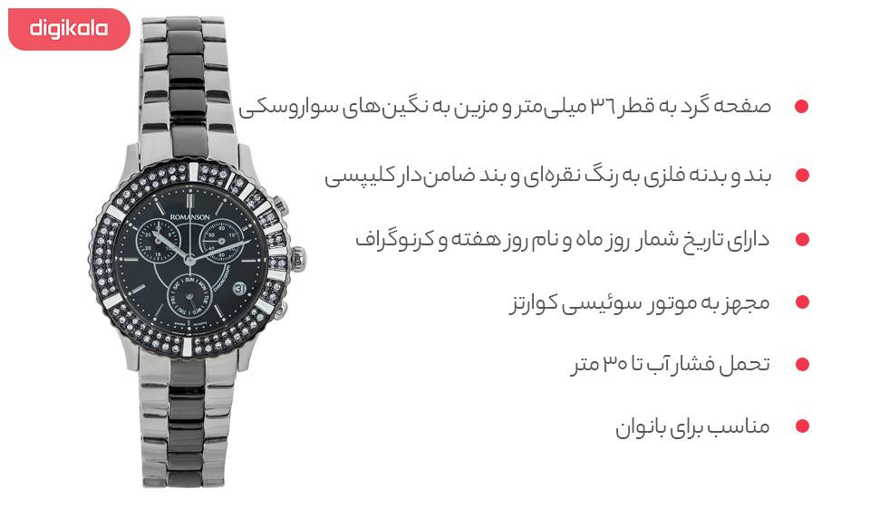 ساعت مچی و عقربه‌ای مدل «RM9229HLDA32W» از برند «رومانسون» (Romanson) ساعتی زنانه است که برای استفاده به صورت روزمره کاملاً مناسب است. ساعت زنانه‌ی رومانسون تکنولوژی ساخت الکترونیکی دارد و منبع انرژی آن باتری بوده و مجهز به موتور کوارتز سوئیسی است. صفحه‌ی گرد و مشکی رنگ رومانسون 36 میلی‌متر قطر دارد و ضخامت بدنه‌ی آن معادل 12 میلی‌متر است. جنس شیشه‌ی به کار رفته بر روی صفحه‌ی ساعت معدنی است. بر روی بزل ساعت از نگین‌های سفید رنگ سواروسکی به کار برده شده است. جنس بدنه و همچنین بند ساعت زنانه‌ِ‌ی رومانسون فلزی و به رنگ نقره‌ای است البته در طراحی بند ساعت در قسمت‌هایی از رنگ نوک مدادی هم استفاده شده است. بند به وسیله‌ی قفل ضامن‌دار و کلیپسی به آسانی باز و بسته می‌شود. رومانسون ساعتی ضدآب است و تا فشار 30 متر در برابر آب مقاومت دارد. رومانسون دارای تاریخ شمار است که شماره‌ی روز ماه و همچنین نام روز هفته را نمایش می‌دهد. همچنین ساعت زنانه‌ی مدل RM9229HLDA32W دارای کرنوگراف است. زیبایی، سادگی و کاربردهای مناسب ساعت زنانه‌ی مدل RM9229HLDA32W برند رومانسون از ویژگی‌هایی است که یک ساعت روزمره‌ی خوب باید دارا باشد. قیمت مناسب رومانسون از دیگر ویژگی‌هایی است که این ساعت را به گزینه‌ای مناسب جهت انتخاب و خرید مبدل می‌کند.