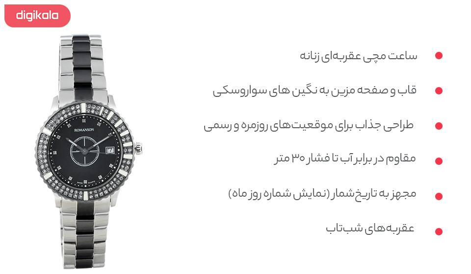 ساعت مچی عقربه ای زنانه رومانسون مدل RM9229TL1DA32W یکی از ساعتهای لوکس زنانه به شمار میرود که از موتوری سوییسی و بدنهای با طراحی خلاقانه بهره میبرد و میتواند توجه سلیقههای مختلف را به خود جلب سازد. ترکیب رنگ نقرهای و مشکی جذابیت خاصی را به این مدل بخشیده است و نظر خریداران زیادی را به خود جلب کرده است. قاب و صفحه مزین به نگین های سواروسکی این ساعت جلوه زیبایی به ساعت بخشیده است. گفتنی است، شرکت «رومانسون» (Romanson) یکی از شرکتهای کرهای فعال در صنعتسازی است که فعالیت خود را در برای اولین بار در سال 1988 آغاز کرد. این شرکت نام خود را با الهام از نام شهری در سوئیس یعنی «رومنسون» (Romanshorn) که زادگاه بسیاری از ساعتهای مطرح سوئیسی به شمار میرود، انتخاب کرده و در طراحی اغلب ساعتهایی که توسط همین شرکت تولید و عرضه میشود از موتورهای باکیفیت سوئیسی استفاده کرده است. گفتنی است، فعالیت این شرکت تنها به ساخت ساعت محدود نشده و تولیدات دیگری نظیر کیف و انواع زیورآلات نیز از محصولات شناختهشدهی این شرکت به شمار میروند.