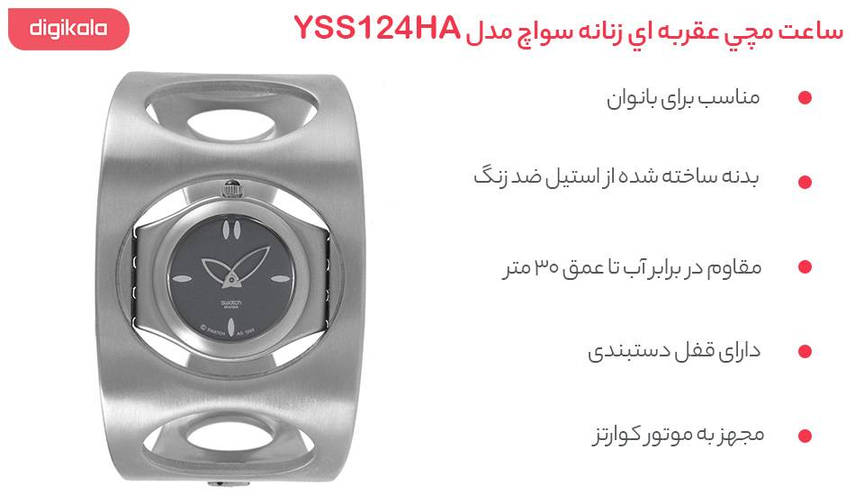 ساعت مچی عقربه‌ای «سواچ» مدل YSS124HA یکی از ساعت‌های شیک و متفاوت این برند مشهور سوییسی است که طرح و نقشی زیبا و بندی دستبندی دارد. این ساعت از گروه ساعت‌های فشن این برند به‌شمار می‌رود که با طراحی همه‌پسندی همراه است. بند استیل و باکیفیت این مدل طرح جالبی دارد که به عنوان یک دستبند هم کارایی دارد. مقاومت در برابر آب هم از جمله ویژگی‌هایی است که نشان از ماندگاری مطلوب ساعت دارد. در مجموع این ساعت را می‌توان یکی از ساعت‌های شیک و باکیفیت و دوست‌داشتنی برشمرد که با توجه به مشخصات ذکرشده، هدیه‌ای ارزشمند برای بانوان جوان و شیک‌پوش به شمار می‌رود. گفتنی است، شرکت سواچ را «نیکلاس هایک» در سال 1983 میلادی، در زوریخ سوییس تاسیس کرد. این کارخانه با رویکرد تولید ساعت‌های سوییسی که برای همه‌ی افراد قابل‌دسترسی باشند، به فعالیت پرداخت. سواچ با هدف فروش یک‌میلیون ساعت در سال، در کنار یک سیستم قیمت‌گذاری هوشمند، کمپین بازاریابی قدرتمندی را راه‌اندازی کرد و توانست با کاهش قطعات داخلی، ساعت‌های ارزان‌تری را تولید کرده و تعداد زیادی ساعت را به بازار سراسر جهان ارائه کند. هم‌زمان با بالارفتن محبوبیت برند سواچ در سراسر جهان، این کارخانه با نوآوری و ارائه‌ی مدل‌های جذاب و متنوع با کارایی بیشتر، نه‌تنها طرفداران خود را بیش‌ازپیش راضی کرد، بلکه نام خود را به‌عنوان یکی از برندهای موفق‌ و محبوب‌ تولید ساعت سوئیسی در جهان ثبت کرد.