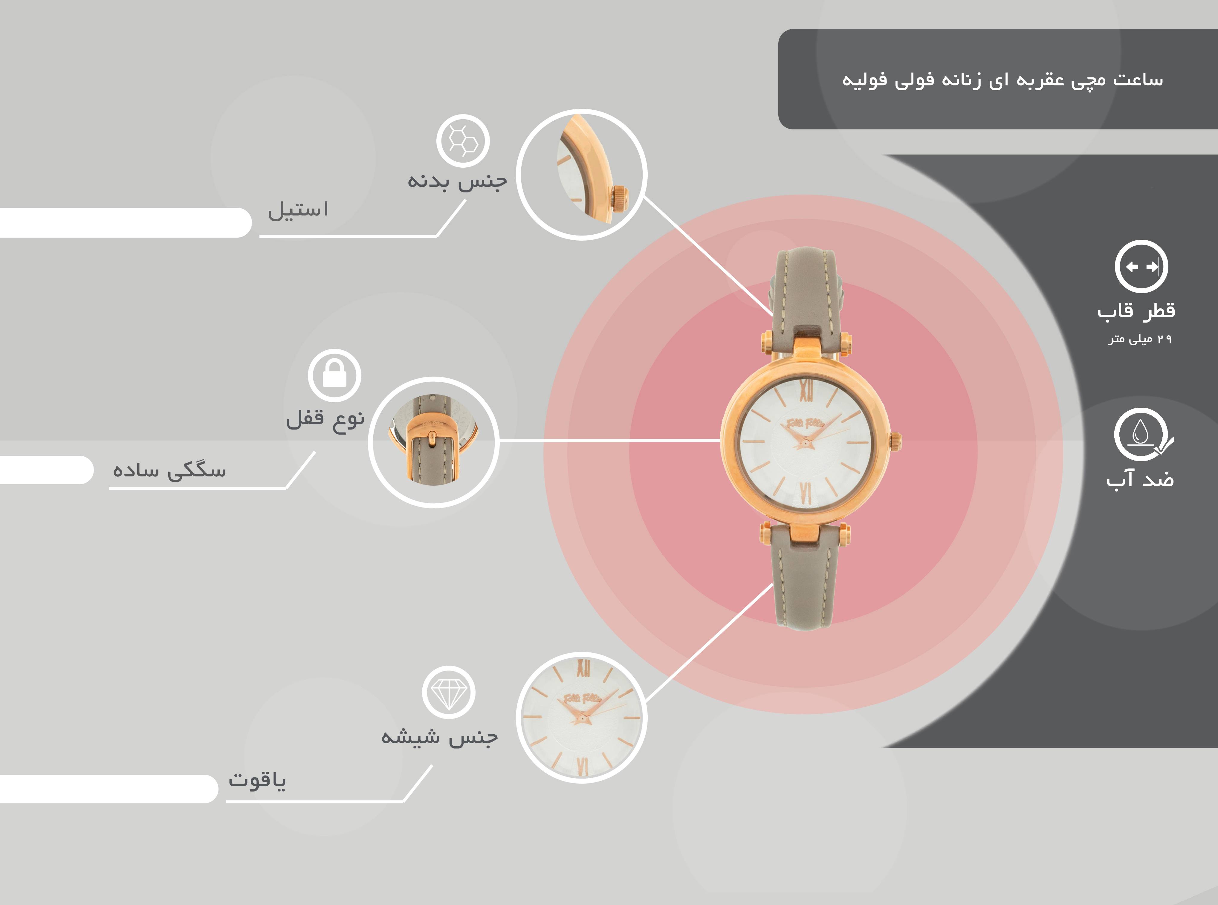 مشخصات فنی Folli Follie WF16R009SPS-DR Watch For Women O7مشخصات کلی محصولفرم قاب گرد مورد استفاده روزمره قطر قاب 29 میلیمتر ضخامت بدنه 5 میلیمتر رنگ صفحه نقرهای جنس شیشه یاقوت (سافایر) جنس بدنه استیل توضیحات جنس بدنه استیل ضدزنگ جنس بند چرم رنگ بند طوسی نوع قفل بند سگکی ساده رنگ بدنه رزگلد ویژگی هاجزئیات - دارای بند ساده - مقاوم در برابر آب در حد شست و شوی دست مشخصاتتاریخ شمار ندارد کرنومتر یا کرنوگراف ندارد عقربه های شب تاب ندارد مقاومت در برابر آب دارد قابلیت نمایش 24 ساعته ندارد
