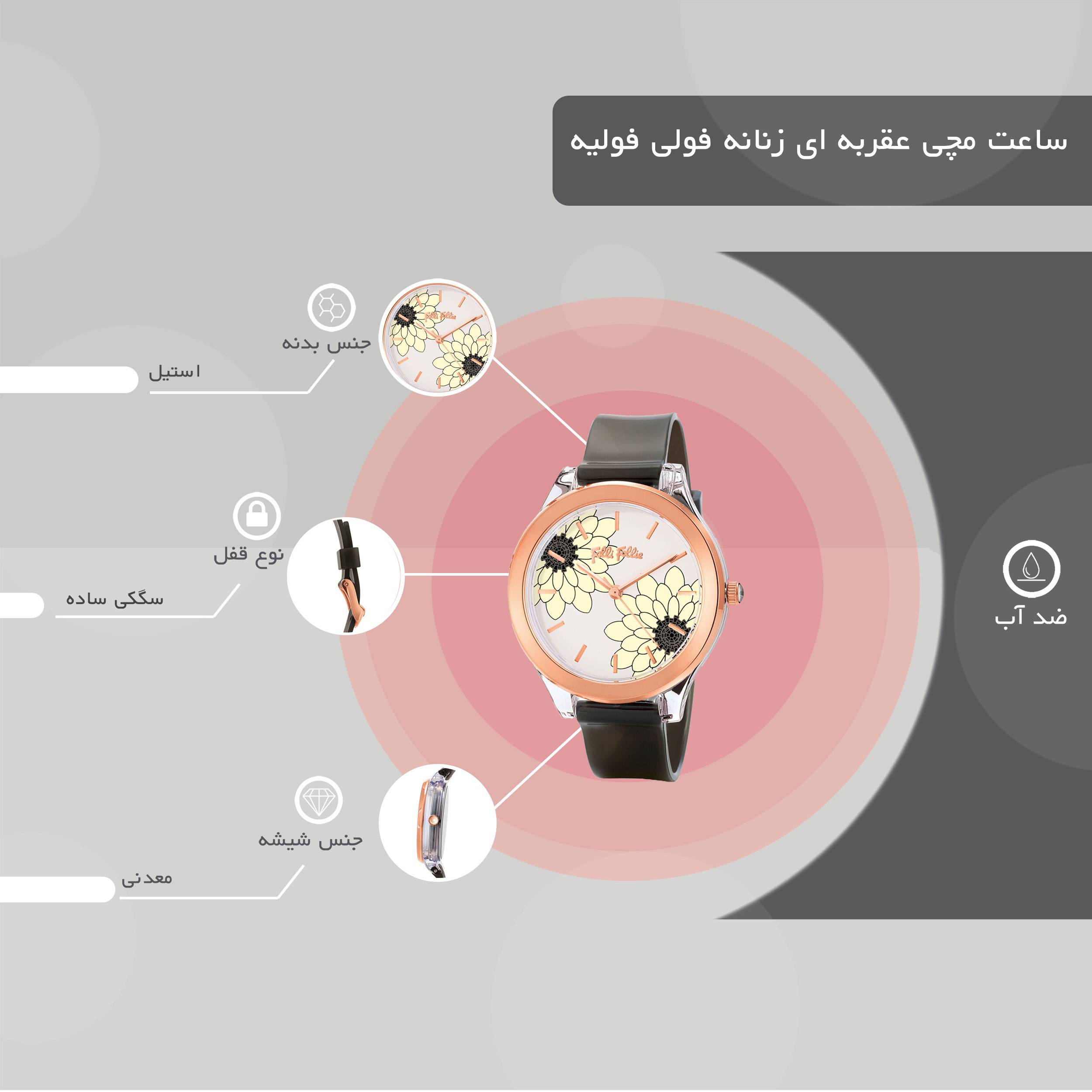 یکی از مهمترین نکاتی که در زندگی روزمره همه ما تأثیر زیادی دارد زمان است. داشتن ساعت مچی به شما کمک میکند که همواره زمان را بدانید و کارهای خود را طبق برنامه و با زمانبندی دقیق به انجام برسانید. ساعت مچی عقربه ای زنانه فولی فولیه مدل WF18P010ZPK-BK میتواند در این زمینه به شما کمک کند. این ساعت علاوهبر کارایی که دارد بسیار باکیفیت بوده و جلوه ظاهری زیبایی دارد. رنگ صفحه این ساعت سفید بوده و با رنگ بدنه آن بهخوبی هماهنگ است. جنس بدنه آن استیل ضدزنگ بوده و رنگ بدنه آن رزگلد است. از ویژگیهای مثبت این ساعت میتوان به مقاومت دربرابر آب شمار اشاره کرد. جنس بند این ساعت لاستیکی بوده و به رنگ مشکی است که زیبایی ساعت را افزایش داده است. ساعت مچی عقربه ای زنانه فولی فولیه مدل WF18P010ZPK-BK یک انتخاب مناسب برای بانوان خوشپوش و خوش سلیقه است.