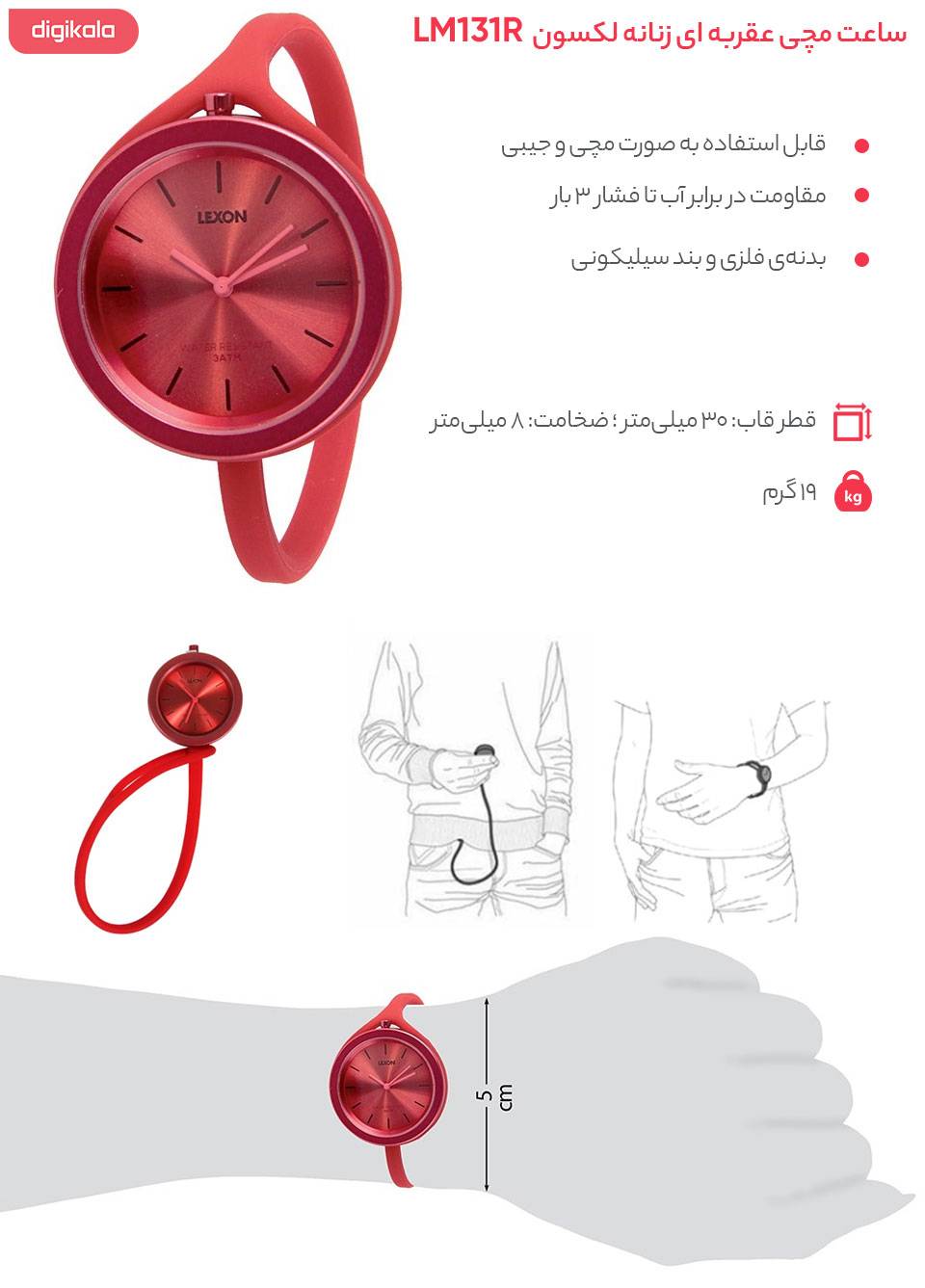 ساعت عقربه‌ای «لکسون» مدل «Lexon LM131R» از ساعت‌های خاص و جذاب زنانه است که با رنگ غالب قرمز و طراحی متفاوت توجه بسیاری را به خود جلب می‌کند. طراحی جالب و خلاقانه‌ی ساعت و بند آن، این امکان را میسر می‌سازد تا نه‌تنها به عنوان یک ساعت مچی بلکه به عنوان یک ساعت جیبی نیز قابل استفاده باشد.
