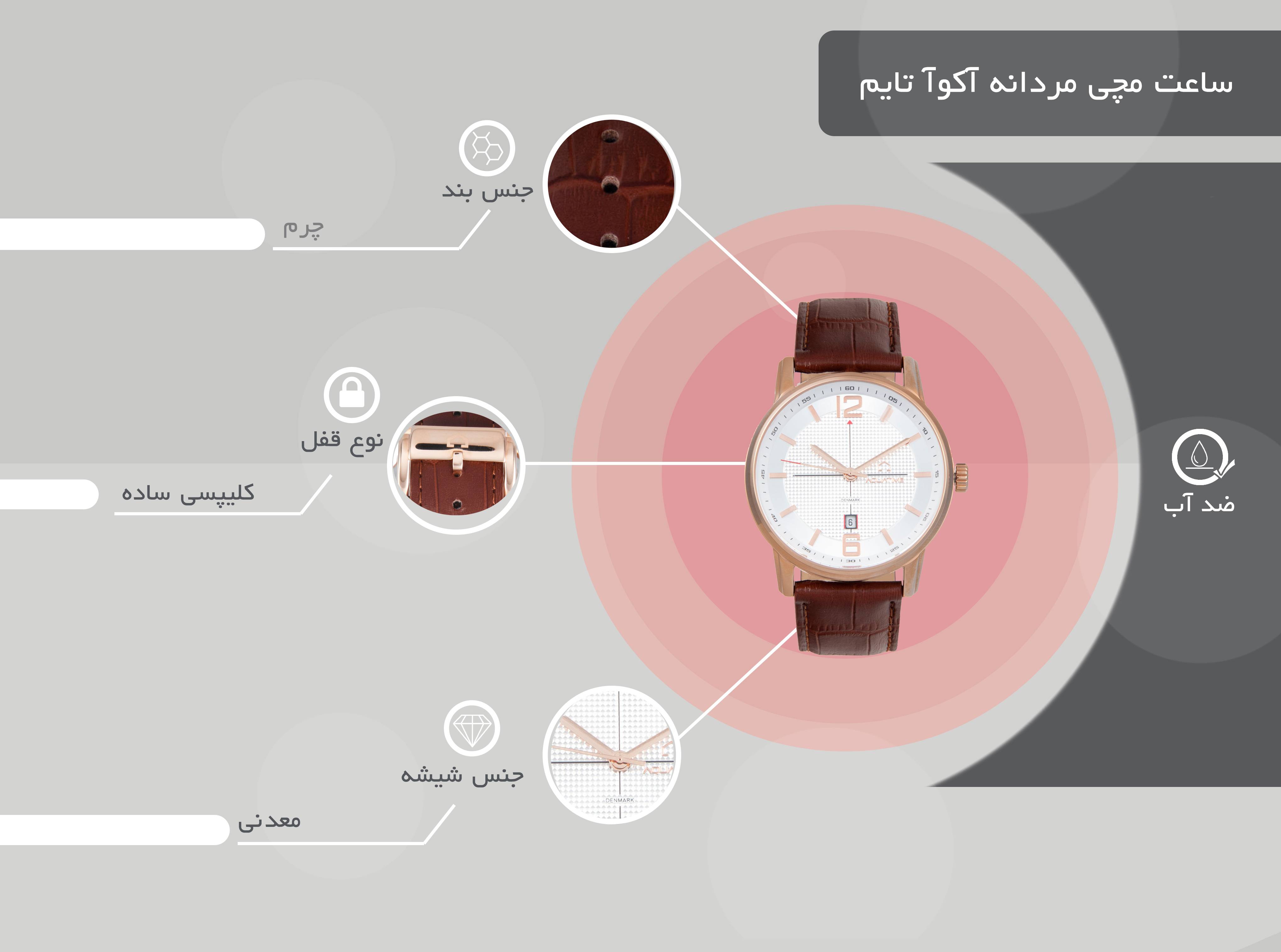 یکی از مهم‌ترین نکاتی که در زندگی روزمره همه ما تأثیر بالایی دارد زمان است. داشتن ساعت مچی به شما کمک می‌کند که همواره زمان را بدانید و کارهای خود را طبق برنامه و با زمان‌بندی دقیق انجام دهید. ساعت مچی عقربه‌ای مردانه آکوآ تایم مدل 50208-04 می‌تواند در این زمینه به شما کمک کند. این ساعت علاوه‌بر کارایی‌ای که دارد بسیار باکیفیت است و جلوه ظاهری زیبایی دارد. رنگ صفحه این ساعت سفید است و با رنگ بدنه‌ی آن به‌خوبی هماهنگ است. جنس بدنه آن استیل ضدزنگ است و رنگ بدنه‌ی آن رزگلد است. از ویژگی‌های مثبت این ساعت می‌توان به مقاومت دربرابر آب اشاره کرد. همچنین این ساعت تاریخ شمار هم دارد. جنس بند این ساعت چرم است و زیبایی ساعت را چندبرابر کرده است. از مشخصات بارز این ساعت می‌توان به قفل سگکی و بند چرمی آن اشاره کرد. ساعت مچی عقربه‌ای مردانه آکوآ تایم مدل 50208-04 یک انتخاب مناسب برای آقایان شیک‌پوش است.