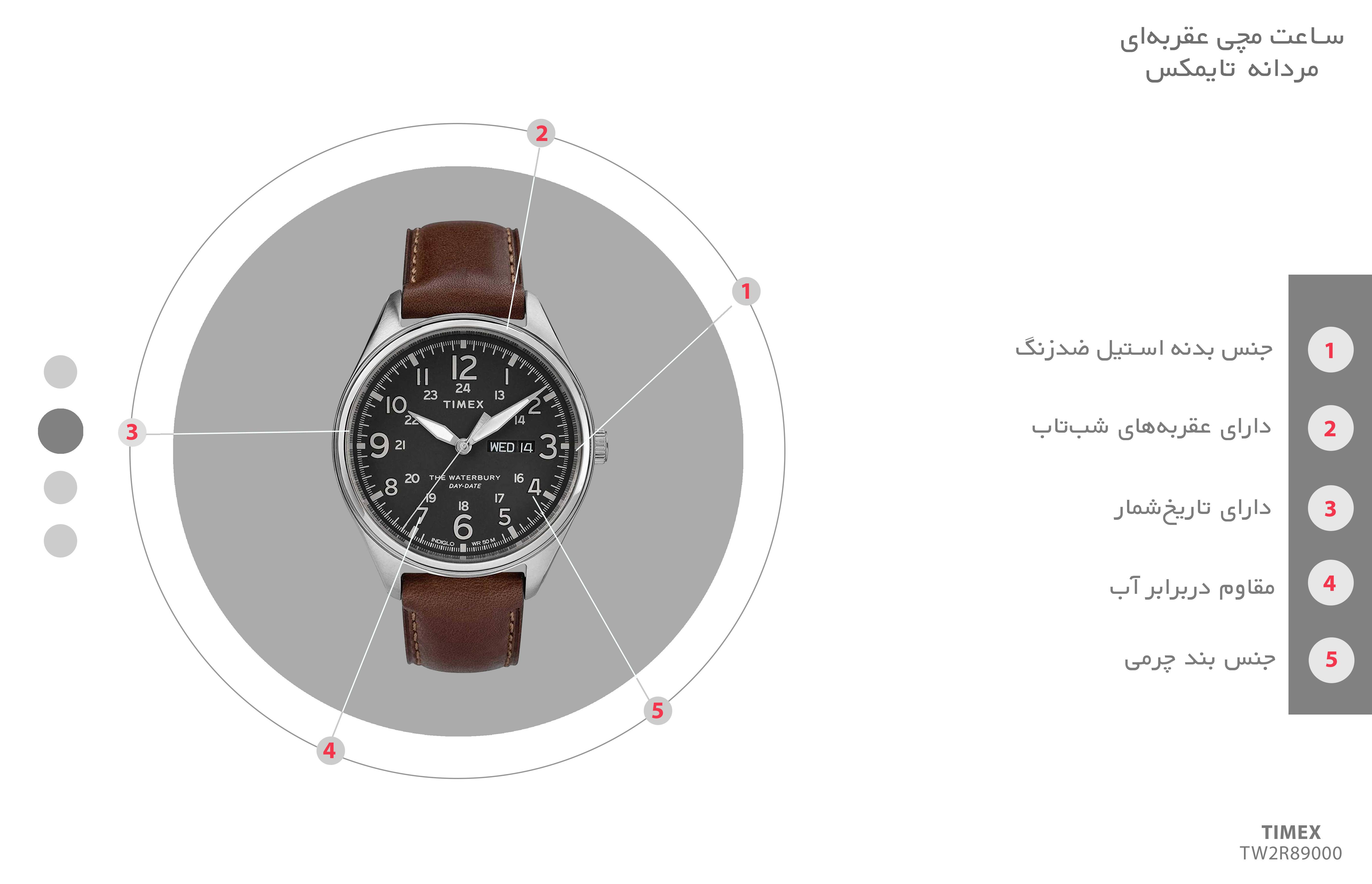 یکی از مهمترین نکاتی که در زندگی روزمره همه ما تأثیر زیادی دارد زمان است. داشتن ساعت مچی به شما کمک میکند که همواره زمان را بدانید و کارهای خود را طبق برنامه و با زمانبندی دقیق به انجام برسانید. ساعت مچی عقربهای مردانه تایمکس مدل TW2R89000 میتواند در این زمینه به شما کمک کند. این ساعت علاوهبر کارایی که دارد بسیار باکیفیت بوده و جلوه ظاهری زیبایی دارد. رنگ صفحه این ساعت مشکی بوده و با رنگ بدنه آن بهخوبی هماهنگ است. جنس بدنه آن استیل ضدزنگ بوده و رنگ بدنه آن نقرهای است و برای کسانی که حساسیت دارند مناسب است. از ویژگیهای مثبت این ساعت میتوان به مقاومت دربرابر آب اشاره کرد. همچنین ساعت مچی عقربهای مردانه تایمکس مدل TW2R89000 دارای عقربههای شبتاب و تاریخشمار است. جنس بند این ساعت چرم بوده و به رنگ قهوهای است که زیبایی ساعت را افزایش داده است. ساعت مچی عقربهای مردانه تایمکس مدل TW2R89000 یک انتخاب مناسب برای آقایان خوشپوش و خوش سلیقه است.
