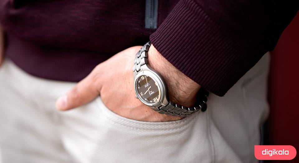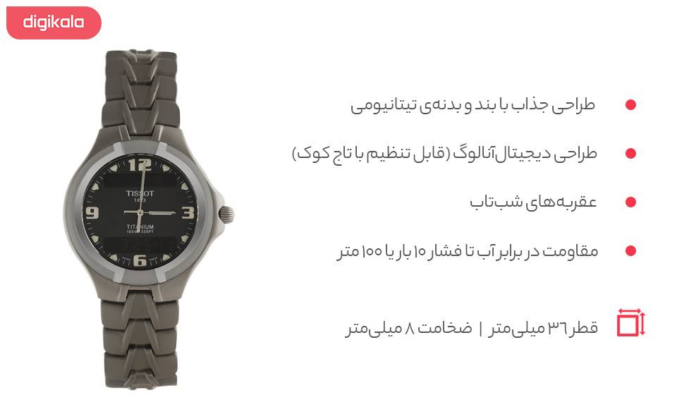 ساعت مچی عقربه‌ای «تیسوت» مدل «T.65.7.488.61» از ساعت‌های جذاب و متفاوت این برند سوییسی است که از رنگ و طرحی همه‌پسند و جالب بهره می‌برد. بند و بدنه‌ی ساعت از جنس تیتانیوم ساخته شده که علاوه بر ارزش خرید و جذابیت کلی ساعت، از نظر وزن هم سبک‌تر از مدل‌های معمول است که می‌توان آن را مزیتی دیگر در نظر گرفت. صفحه‌ی ساعت به رنگ زغالی است که در بالا و پایین آن شاهد دو نمایشگر دیجیتال هستیم. طراحی جالب ساعت به شما اجازه می‌دهد تا با تاج کوک ساعت که علاوه‌بر چرخش، به عنوان کلیدی فشاری نیز استفاده می‌شود، ساعت آنالوگ و بخش دیجیتال ساعت را کنترل و تنظیم کنید. روی صفحه، شاهد نشانگرهای خطی و عددی هستیم که زیبایی خاصی به ساعت بخشیده‌اند. علاوه‌بر دو عقربه‌ی اصلی، نشانگرهای خطی هم شب‌تاب طراحی شده‌اند. این ساعت سوییسی در کنار بدنه‌ی تیتانیومی و شکیل، از مقاومت بالایی در برابر آب برخوردار است. مقاومت تا فشار 10 بار یا 100 متر تقریبا در تمام موقعیت‌های روزمره نظیر بارش باران یا شست‌وشوی دست از نفوذ آب به بدنه جلوگیری می‌کند. قطر قاب هم در کنار زیبایی و طرح خلاقانه، این ساعت سوییسی را به گزینه‌ای همه‌پسند و البته هدیه‌ای مهیج و لوکس تبدیل می‌کند.