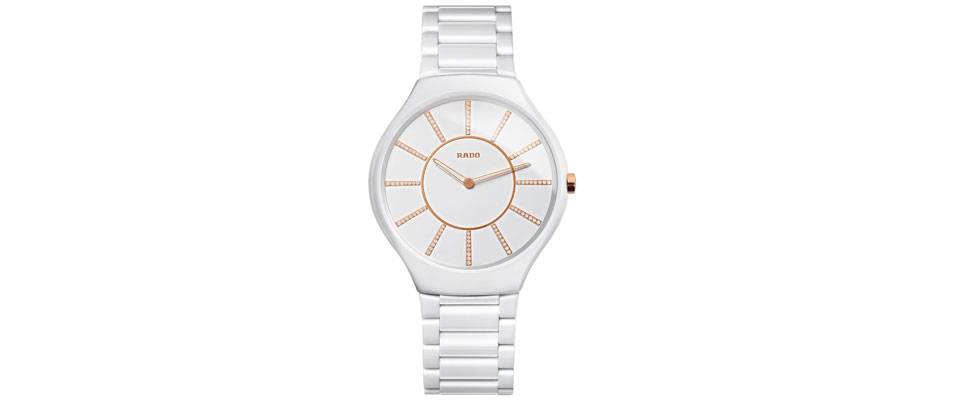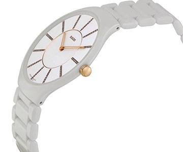 ساعت عقربهای رادو مدل «140.0957.3.070» از سری «True Thinline» است که در دو سایز بزرگ و کوچک طراحی شده است. ساعتهای این سری از طراحی مینیمال و سادهای برخورداند. اما در عین سادگی زیبایی خاصی دارند و همه از مدلهای شیک رادو محسوب میشوند. روی صفحهی سفید این ساعت تعداد زیادی نگین سفید به کار رفته که ظاهری لوکس به آن دادهاند. از طرف دیگر سادگی صفحه باعث شده نگینهایی که روی خطوط طلایی کار شدهاند بیشتر به چشم بیایند. البته زیبایی و شیک بودن تنها مشخصههای این سری نیستند. سرامیک پیشرفتهی به کار رفته باعث شده ساعت بسیار مقاوم باشد. از همین رو میتوان با خیال راحت در طول روز از آن استفاده کرد.