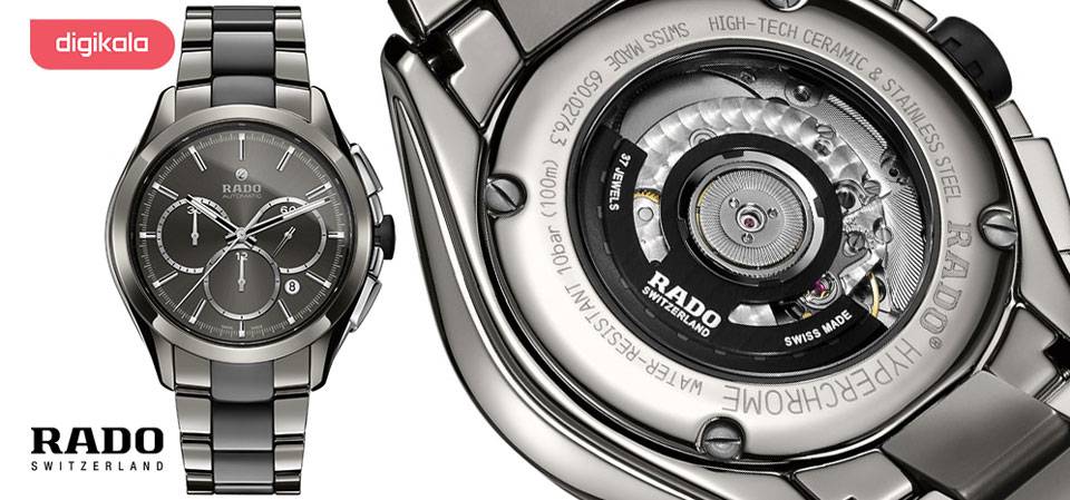 ساعت مچی عقربه‌ای «رادو» مدل «Rado 650.0276.3.011» از سری «Hyperchrome» یکی از لوکس‌ترین ساعت‌های کلاسیک‌اسپرت رادو است که از طراحی جذاب، کارآمد و کیفیت و دقتی منحصربه‌فرد بهره می‌برد. برای این ساعت یک موتور خودکار در نظر گرفته شده است که بدون نیاز به باتری کار می‌کند و انرژی مکانیکی آن از حرکات معمول دست تامین می‌شود. با توجه به قابلیت‌های کرنوگراف یا زمان‌سنج، اهمیت حرکتی‌بودن موتور و بی‌نیازی به باتری دوچندان می‌شود. در طراحی موتور پرقدرت «ETA 2894-2» در این مدل، 37 سنگ قیمتی استفاده شده است که ضمن به حداقل‌رساندن استهلاک، مزایایی چون افزایش دقت و طول عمر بالای موتور را به همراه دارد. همچنین این موتور می‌تواند در صورت ساکن‌ماندن ساعت، تا 45 ساعت پس از اولین حرکت دست یا ساعت به عملکرد خود ادامه دهد. این تمام چیزی نیست که این مدل را به یک ساعت لوکس و متمایز تبدیل ساخته است. در این مدل از سری هایپرکروم، یک قاب یکپارچه به قطر 45 میلی‌متر و بندی بسیار جذاب از جنس سرامیک پیشرفته‌ی پلاسما در نظر گرفته شده که با بخشی از جنس Stainless Steel همراه است. سرامیک پیشرفته‌ی پلاسما (Plasma High-Tech Ceramic) از جمله مشتقات خاص سرامیک است که برای اولین بار مهندسان شرکت رادو از آن در طراحی ساعت‌های مچی استفاده کردند. این ماده که از تمام ویژگی‌های ممتاز سرامیک پیشرفته نظیر وزن کم، سازگاری با انواع پوست و ایجادنکردن حساسیت پوستی، مقاومت و استحکام بالا و همچنین کاملا ضدخش‌بودن بهره‌مند است، از ظاهری براق‌تر و فولادین نیز بهره می‌برد. بدین ترتیب، در کنار استحکام بالا، وزن سبک و سازگاری با انواع پوست معمولی و حساس از دیگر ویژگی‌های ممتاز و قابل‌توجه این ساعت محسوب می‌شود. مقاومت بالای بدنه دربرابر آب (10ATM) نیز از دیگر مشخصات بارز کیفی این مدل است که در تمامی شرایط روزمره (شست‌وشوی دست و بارش باران) و همچنین در شرایطی که ساعت در تماس نسبتا بلندمدتی با آب قرار می‌گیرد، از نفوذ آب به بدنه جلوگیری می‌کند. این ساعت لوکس و شیک را می‌توان یکی از جذاب‌ترین ساعت‌های لوکس کلاسیک‌اسپرت برشمرد که با توجه به مشخصات ظاهری و کیفی یادشده، هر مرد شیک‌پوشی را شیفته‌ی اصالت، کیفیت و طراحی بی‌نظیر خود می‌کند.