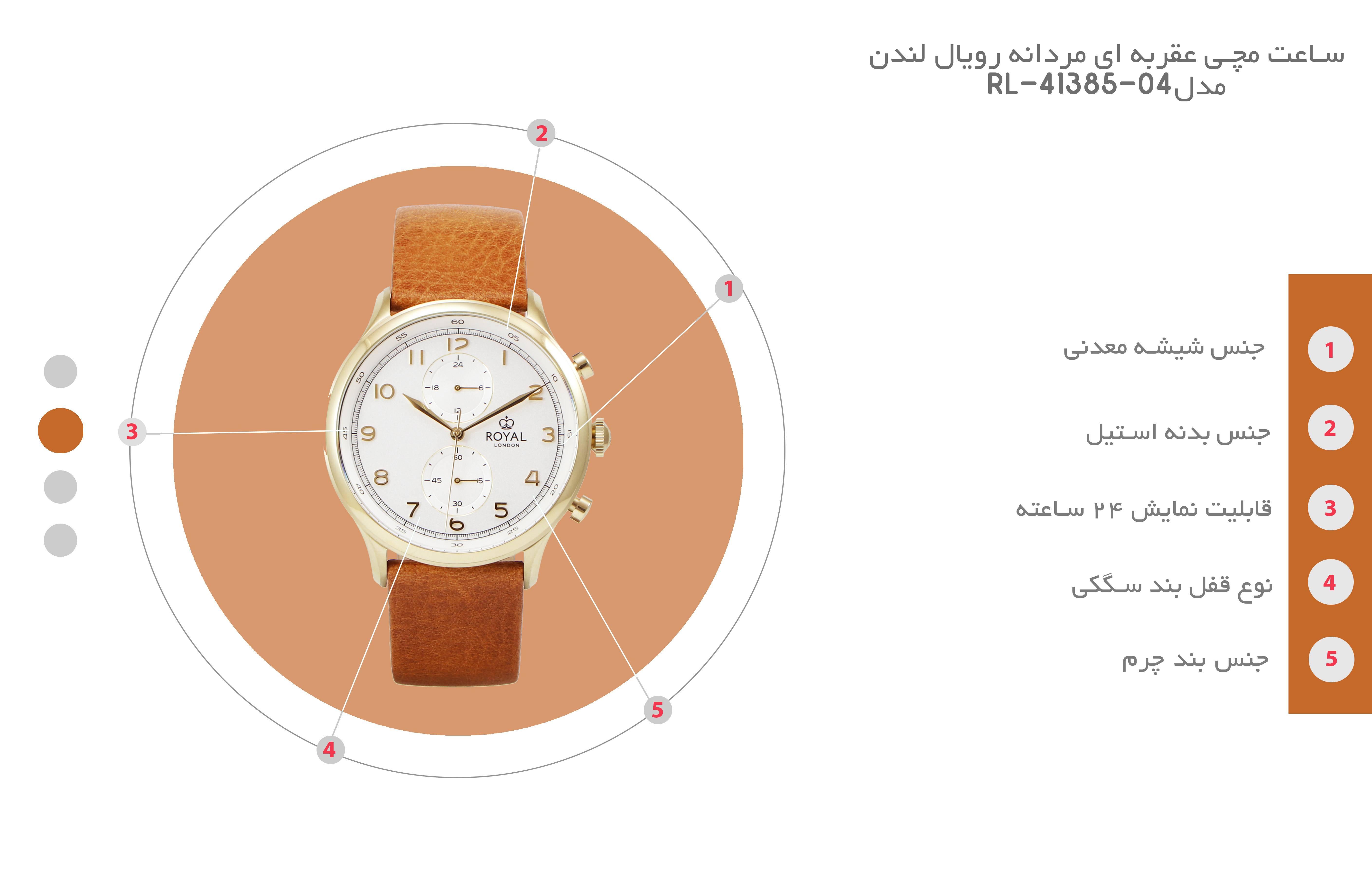 ساعت مچی عقربهای مدل RL-41385-04 از محصولات شیک با طراحی متفاوت و خلاقانه برند رویاللندن است. در طراحی این ساعت دوستداشتنی از رنگ استیل طلایی استفاده شده که زیبایی خاصی به محصول دادهاست. فرم قاب این ساعت گرد بوده و رنگ صفحه آن سفید است. ساعت مچی عقربهای مدل RL-41385-04 قابی استیل به رنگ طلایی دارد که پین مربوط به تنظیم ساعت به زیبایی و بهرنگ طلایی به آن متصل است. این ساعت امکان نمایش 24 ساعته را نیز داراست که نشانگر آن روی صفحه ساعت به چشم میخورد. یکی دیگر از نقاط قوت این مدل، بند استفادهشده برای آن است. بند این ساعت از مرغوبترین چرمها ساخته شدهاست که رنگ قهوهای آن بهخوبی با صفحه ساعت هماهنگ شده است. نوع قفل این ساعت سگکی ساده بوده و جنس شیشه آن نیز معدنی است. در مجموع اگر قصد خرید یک ساعت بادوام و باکیفیت در این سبک و سیاق را دارید، این مدل انتخابی عالی برای موقعیتهای مختلف و همچنین هدیهای باارزش و ماندگار محسوب میشود.
