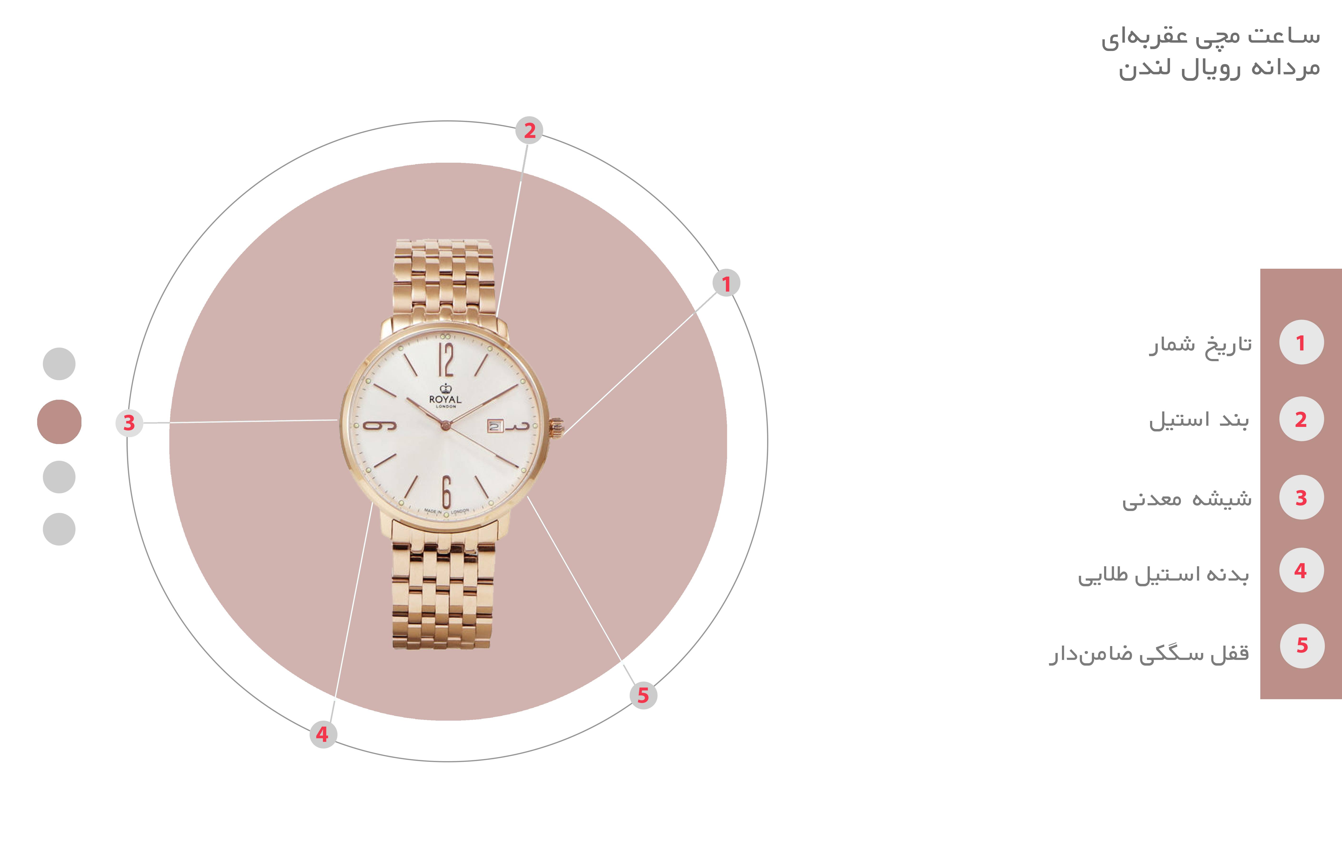 ساعت مچی عقربهای مدل RL-41415-04 از محصولات شیک با طراحی متفاوت و خلاقانه برند رویاللند است. در طراحی این ساعت دوستداشتنی از رنگ طلایی استفاده شده که زیبایی خاصی به محصول دادهاست. فرم قاب این ساعت گرد بوده و رنگ صفحه آن سفید است. ساعت مچی عقربهای مدل RL-41415-04 قابی استیل به رنگ طلایی دارد که پین مربوط به تنظیم ساعت به زیبایی و بهرنگ طلایی به آن متصل است. این ساعت امکان نمایش تاریخ روز را نیز داراست که نشانگر آن روی صفحه ساعت به چشم میخورد. یکی دیگر از نقاط قوت این مدل، بند استفادهشده برای آن است. بند این ساعت از مرغوبترین استیل ساخته شدهاست که رنگ طلایی آن بهخوبی با صفحه ساعت هماهنگ شدهاست. در مجموع اگر قصد خرید یک ساعت بادوام و باکیفیت در این سبک و سیاق را دارید، این مدل انتخابی عالی برای موقعیتهای مختلف و همچنین هدیهای باارزش و ماندگار محسوب میشود.