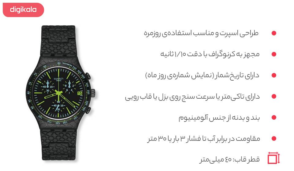 ساعت مردانه و اسپرت سواچ با ظاهر زیبایی که دارد، جذابیت پوشش روزانهی شما را تکمیل خواهد کرد. طراحی منحصربهفرد بند و بدنهی آلومینیومی و سه قابلیت اسپرت کرنوگراف، تاریخشمار و تاکیمتر، این مدل را به هدیهای مهیج و جذاب برای آقایان جوان تبدیل کرده است.