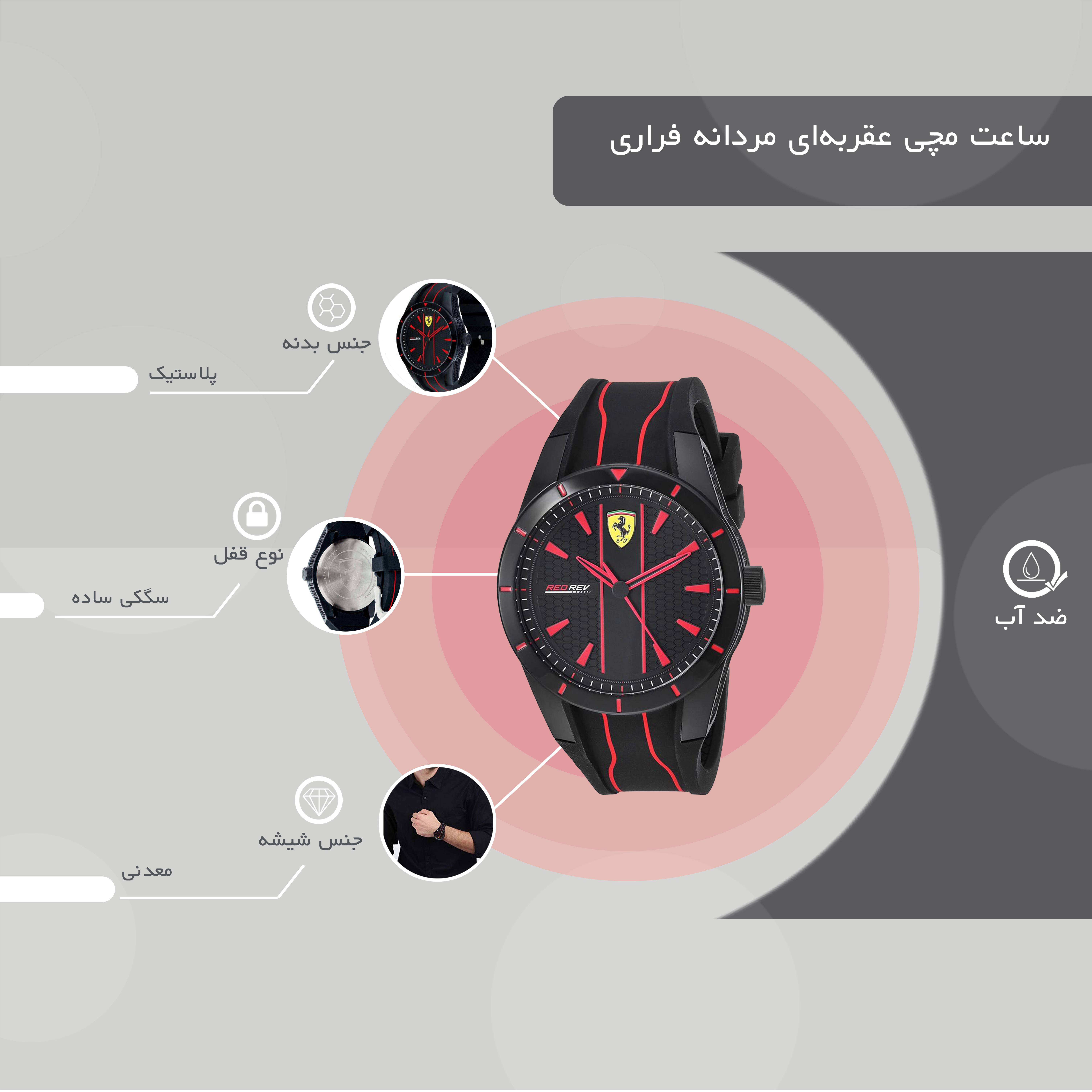 همه ما همیشه می‌خواهیم ظاهری آراسته و شیک داشته باشیم به‌همین دلیل علاوه‌بر لباس، از زیورآلات و وسایل مختلفی نیز استفاده می‌کنیم. یکی از لوازمی که می‌تواند تکمیل کننده استایل ما باشد، ساعت مچی است. تقریبا همه برند فراری را می‌شناسند و شاید دوست داشته باشند ساعتی با نام این برند خریداری کنند. این ساعت لوکس دارای قطر قاب 44 میلی‌متری است و به‌همین دلیل برای آقایان مناسب است. جنس بدنه این ساعت پلاستیک بوده و از کیفیت بسیار بالایی برخوردار است. جنس بند این ساعت نیز لاستیکی بوده و ساختار مستحکمی دارد. فرم قاب این ساعت به‌صورت گرد طراحی شده و در صفحه آن از رنگ قرمز که یکی از نماد‌های برند فراری است به زیبایی استفاده شده است که با ترکیب رنگ مشکی بند آن، ظاهری بسیار شیک و زیبا ساخته است. جنس شیشه این ساعت نیز از مواد معدنی است که کیفیت بسیار بالایی دارد. این ساعت می‌تواند به‌عنوان اسپرت، لوکس و روزمره مورد استفاده قرار گیرد.