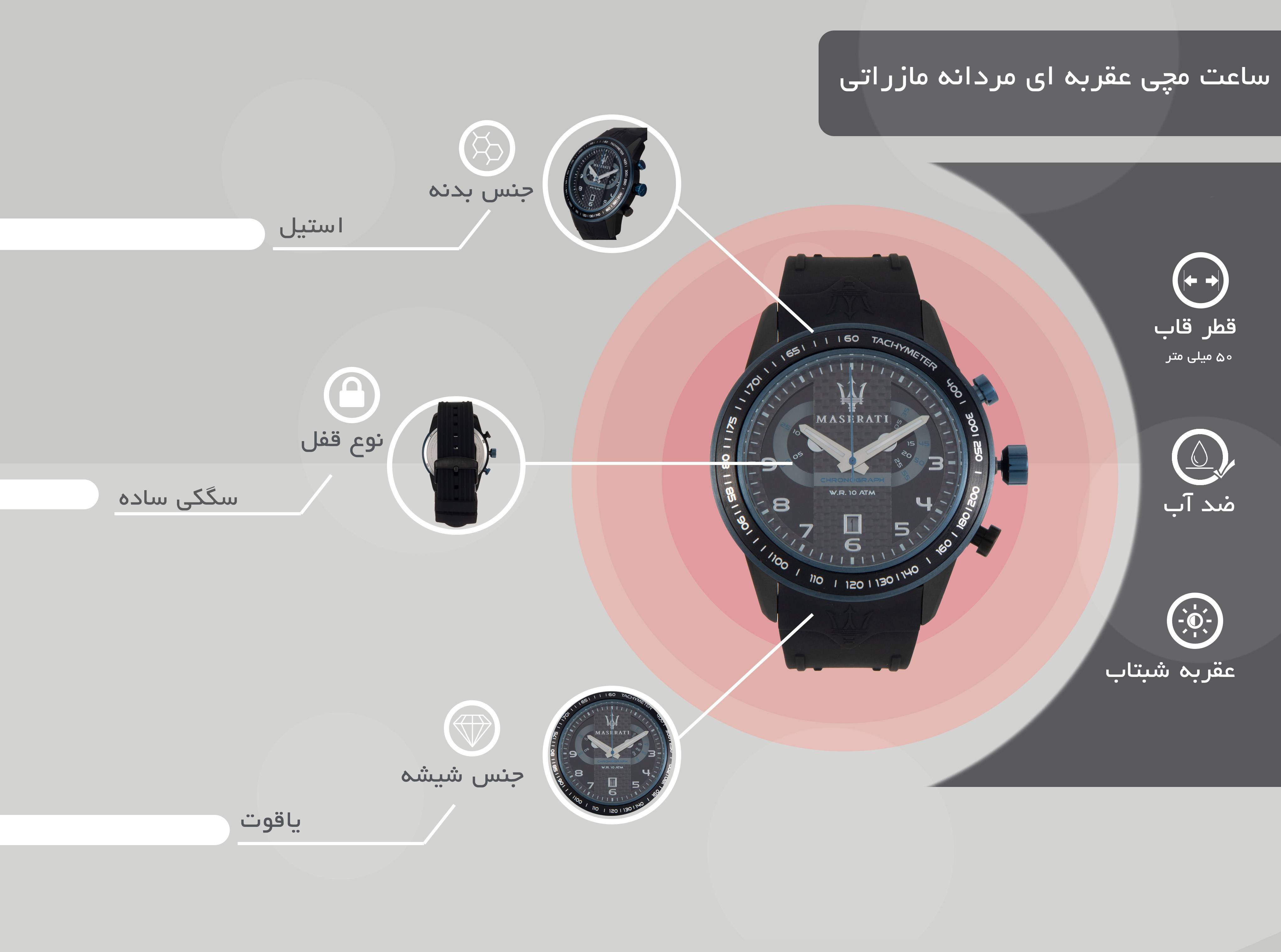 مشخصات فنی Maserati R8871610002 Watch For Menمشخصات کلی محصولفرم قاب گرد مورد استفاده روزمره قطر قاب 50 میلیمتر ضخامت بدنه 10 میلیمتر رنگ صفحه مشکی جنس شیشه معدنی جنس بدنه استیل توضیحات جنس بدنه استیل ضد زنگ جنس بند لاستیکی رنگ بند مشکی نوع قفل بند سگکی ساده رنگ بدنه سرمهای مشخصاتتاریخ شمار دارد کرنومتر یا کرنوگراف دارد عقربه های شب تاب دارد مقاومت در برابر آب دارد میزان مقاومت در برابر فشار آب 10ATM قابلیت نمایش 24 ساعته دارد