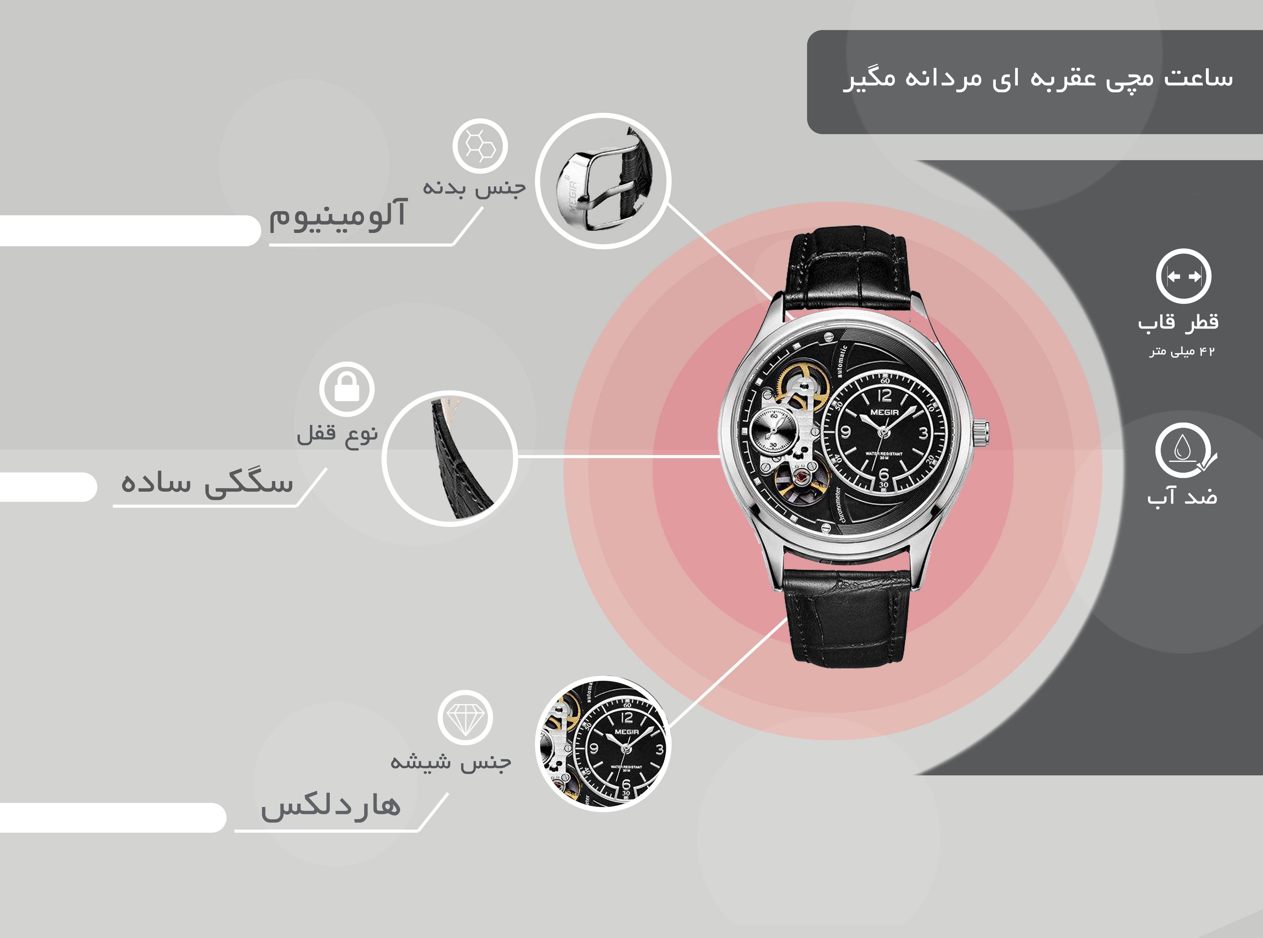 مشخصات فنی مشخصات کلی محصولفرم قاب گرد مورد استفاده روزمره , رسمی , لوکس , فشن قطر قاب 42 میلیمتر عرض قاب 42 میلیمتر ضخامت بدنه 12 میلیمتر رنگ صفحه مشکی جنس شیشه هاردلکس جنس بدنه آلومینیوم توضیحات جنس بدنه آلومینیوم جنس بند چرم رنگ بند مشکی نوع قفل بند سگکی ساده رنگ بدنه نقرهای مشخصاتتاریخ شمار ندارد کرنومتر یا کرنوگراف ندارد سرعت سنج ندارد عقربه های شب تاب ندارد مقاومت در برابر آب دارد میزان مقاومت در برابر فشار آب 3ATM قابلیت نمایش 24 ساعته ندارد