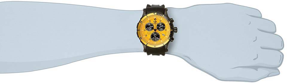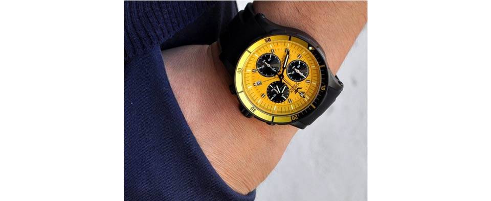 استفاده از ترکیب رنگ شاد و مهیج و جوانپسند زرد با مشکی اولین چیزی است که موجب تمایز این مدل با دیگر ساعتهای این سری شده است. هر دو بندی که همراه ساعت عرضه شده مشکیرنگ بوده و بدنهی ساعت هم به رنگ مشکی مات طراحی شده است. برای صفحه و بخشی از قاب رویی یا bezel هم از زرد خوشرنگی استفاده شده که به یکی از بهترین ترکیبرنگهای این سبک تبدیل شده است. این مدل دارای قابی با قطر 48 میلیمتر و ضخامت تقریبی 16 میلیمتر است که عرض قاب آن با تاج کوک به حدود 52 میلیمتر میرسد. بدین ترتیب این مدل را میتوان در بین ساعتهای نسبتا بزرگ دستهبندی کرد که شاید برای هر سلیقه یا اندازهی مچی مناسب و قابلقبول نباشد. با وجود این، قابلیتهای مهیج ساعت، ابعاد آن را برای افرادی که قصد خرید ساعتی لوکس و اسپرت دارند قابل توجیه میکند. بدنهی این مدل از جنس استیل ساخته شده که در کنار مقاومت در برابر آب تا فشار 20بار، کیفیت و ماندگاری مطلوبی را برای ساعت تضمین میکند. همراه ساعت دو بند مختلف عرضه میشود تا نهتنها برای استفادههای مختلف ورزشی از جمله شناگری، بلکه برای استفادهی روزمره هم کاملا قابل استفاده باشد. یکی از بندها بندی کلاسیک از جنس چرم به رنگ مشکی با دوخت زرد است که با طراحی صفحه کاملا تناسب دارد. بند دوم هم بندی اسپرت و سیلیکونی و کاملا راحت و مقاوم است. ترکیب رنگ مشکی و قرمز روی قاب رویی یا bezel هم استفاده شده که به زیبایی ساعت برای آقایان شیکپوش و طرفدار این سبک افزوده است. هر دو بند عرض 24 میلیمتر و قفلی سگکی و استیل مشکیرنگی دارند تا با هر دو بند ترکیبی کاملا متناسب و البته راحتی مطلوبی را شاهد باشیم. کلیدهای کرنوگراف و تاج کوک در سمت راست به صورت تمامفلزی و همرنگ بدنه طراحی شدهاند که ظاهر ساعت را بیش از پیش به یک مدل کاملا اسپرت نزدیک میکنند.