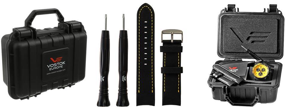 ساعت در یک باکس محکم و شکیل پلاستیکی عرضه میشود که در داخل آن خود ساعت و متعلقات آن به شکلی زیبا و منظم چیده شده است. منظور از متعلقات ساعت، بند اضافه و همچنین یک جفت آچار مخصوص است. این آچارها برای تعویض بندها مورد استفاده قرار میگیرند. بدین ترتیب انتخاب و عوض کردن بند کلاسیک برای موقعیتهای روزمره و کلاسیک و انتخاب بند سیلیکونی یا اسپرت برای استفاده با پوششهای اسپرت و یا موقعیتهای ورزشی، در کمترین زمان و به سادگی قابل انجام خواهد بود.