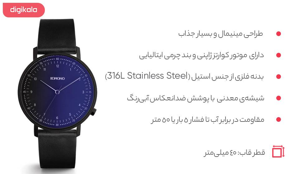 ساعت مچی کلاسیک و مینیمال «کومونو» (Komono) مدل «Lewis Midnight» یکی از جذاب‌ترین ساعت‌های این برند است که از رنگ غالب مشکی و طراحی ظریف و دوست‌داشتنی صفحه بهره می‌برد. روی صفحه‌ی ساعت شاهد اعداد و نشانگرهای ظریف و جذابی هستیم که در حاشیه‌ی صفحه به چشم می‌خورند. ترکیب رنگ غالب مشکی بند و بدنه و صفحه‌ی تیره‌رنگ ساعت آن را به مدلی متفاوت و البته همه‌پسند تبدیل کرده است. این ساعت تقریبا با هر رنگ و استایلی تناسب دارد. شیشه‌ی معدنی ساعت دارای یک پوشش ضدانعکاس (anti-reflect) است که نه‌تنها موجب می‌شود در شرایط نوری مختلف به‌خوبی بتوانید نشانگرها و عقربه‌های ظریف ساعت را مشاهده کنید، بلکه با رنگ آبی‌اش ترکیب جذاب‌تری را ایجاد کرده است. ظرافت عقربه‌ها هم در نوع خود جالب و جذاب است که زیبایی قابل‌توجهی را به ساعت بخشیده است. تاج کوک ساعت هم همانند اکثر ساعت‌های این برند روی قاب در موقعیت ساعت چهار تعبیه شده است. در کنار قاب فلزی و مشکی مات، بند چرمی و ایتالیایی این ساعت هم طرحی ساده و فوق‌العاده جذاب دارد. بند ایتالیایی و بدنه‌ی تمام استیل ساعت هم نشان از کیفیت مطلوب ساعت دارند. مقاومت در برابر آب را هم می‌توان یکی دیگر از مزایای کیفی ساعت در نظر گرفت. مقاومت در برابر آب تا فشار 50 متر در اغلب موقعیت‌های روزمره نظیر شست‌وشوی دست یا بارش باران از نفوذ آب به بدنه جلوگیری خواهد کرد. درمجموع اگر قصد خرید یک ساعت شیک و روزمره را دارید، این مدل با بند چرمی و طراحی مینیمال و تناسبی همه‌پسند، یکی از بهترین گزینه‌ها و همچنین هدیه‌ای باارزش و ماندگار خواهد بود.