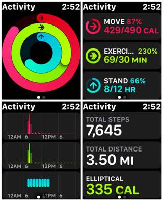 اپلیکیشن Activity هم مکملی کاربردی برای Workout و اپلیکیشنی ساده و کارآمد برای تمام کاربران اپل واچ است. این اپلیکیشن فعالیت و تحرک فیزیکی شما را با سه مولفه‌ی حرکت، تمرین و ایستادن یا سکون (Move ،Exercise و Stand) همواره تحت‌نظر دارد و به شما کمک می‌کند حداقل با تمرین و تحرک بیشتر، سلامت خود را در حد مطلوبی حفظ کنید. ویژگی جالب و کاربردی این اپ، امکان تنظیم میزان هدف یا Goal برای کالری مصرفی روزانه است.