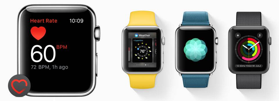 تنوعی از سنسورها: سنسورهای شتاب‌سنج، ژیروسکوپ و ضربان قلب ترکیب کاملی هستند که برای کارایی هر چه بهتر و بیشتر اپل واچ در این گجت دوست‌داشتنی گرد هم آمده‌اند. سنسورهای شتاب‌سنج و ژیروسکوپ در پایش فعالیت‌های ورزشی و همچنین کنترل اپل واچ، بیشترین نقش را ایفا می‌کنند. سنسور ضربان قلب هم شاید کارآمدترین و جذاب‌ترین قابلیت اپل واچ برای پایش وضعیت سلامتی باشد، از فناوری جالبی برای شمارش ضربان قلب از طریق نبض استفاده می‌کند. این فناوری بر پایه‌ی علم نور و پتانسیل خون قرمزرنگ در جذب نور سبز طراحی شده است. در پشت ساعت، دو چراغ LED صد بار در ثانیه، نوری سبزرنگ به نبض شما می‌تابانند و دو حسگر دیگر میزان جذب این نور توسط خون قرمزرنگ را می‌سنجند و تعداد دفعاتی را که بیشترین جذب نور (با توجه به جریان بیشتر خون) صورت می‌گیرد، به‌عنوان یک نبض شناسایی و ثبت می‌کنند. این سنسور قادر است به صورت منظم و پیوسته، ضربان قلب را طی استفاده از اپلیکیشن تمرینات ورزشی یا Workout ثبت کند و در کنار دیگر معیارها به شما نمایش دهد تا به بهترین نحو، بازدهی ورزش و فعالیت‌های خود را محک بزنید و با دیگر دوستان یا افراد خانواده به اشتراک بگذارید.