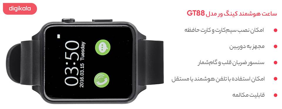 این ساعت صفحه‌مربعی، قابلیت نصب سیم‌کارت نیز دارد. بدین ترتیب می‌توان آن را یک واچ‌فون (Watch Phone) یا تلفن ساعتی مستقل نیز در نظر گرفت. بدین معنی که می‌توان حتی مستقل از تلفن هوشمند و با نصب یک سیم‌کارت هم برای تماس و هم برای ارسال و دریافت پیام از آن استفاده کرد. برخورداری از میکروفون و اسپیکر داخلی، امکان پاسخ به تماس‌ها یا برقراری تماس را به همراه دارد. با کینگ‌ور GT88 هم می‌توان با استفاده از شماره یا سیم‌کارت گوشی متصل‌شده به ساعت با دیگران تماس گرفت یا تماس‌ها را پاسخ داد و هم می‌توان تماس‌های سیم‌کارت نصب‌شده در ساعت (local sim) را مدیریت کرد. البته این تنها قابلیتی نیست که این مدل را در این بازه‌ی قیمتی متمایز می‌کند. قابلیت مهم دیگر ساعت، بهره‌مندی از سنسور سنجش ضربان قلب (Heart Rate Sensor) است. در کنار سنسور ضربان قلب، سنسور گام‌شمار هم دیگر ویژگی موردتوجه ورزش‌دوستان بوده که در این ساعت تعبیه شده است.