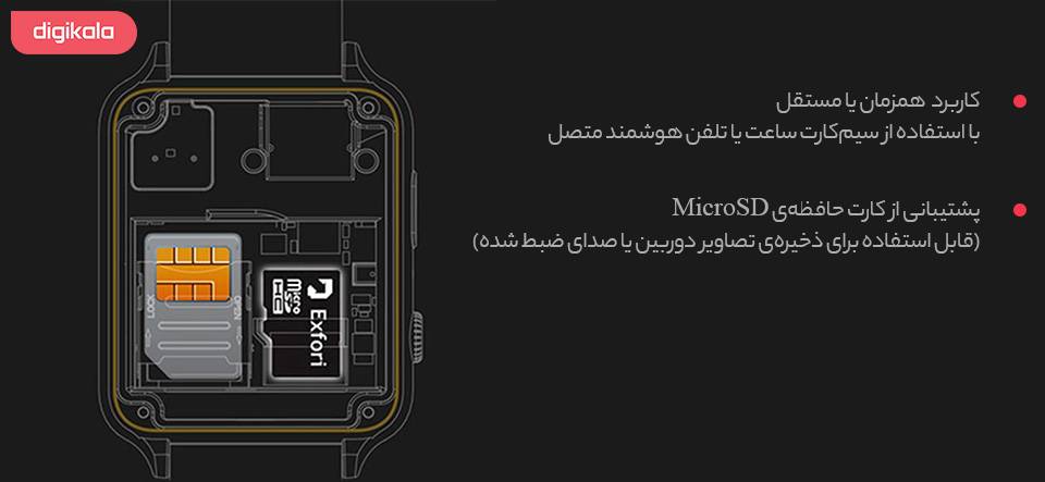 دوربین این مدل هم اگرچه خیلی معمولی و ضعیف‌تر از دوربین گوشی‌های هوشمند است، ممکن است در مواردی خاص یکی از کارآمدترین ابزارهای در دسترس شما باشد. این دوربین 0.3 مگاپیکسلی قادر است تصاویر عکاسی‌شده را روی کارت حافظه‌ای که داخل ساعت می‌گذارید، ذخیره کند. سنسور تنظیم و تشخیص دستورات حرکتی هم یکی از ابزارهای جالب است که در مدل‌های مشابه این ساعت‌های هوشمند کمتر دیده می‌شود. از طریق بخش تنظیمات می‌توانید به‌عنوان مثال تعریف کنید که در صورت زنگ‌خوردن ساعت، با تکان یا حرکت دست (shake)، ساعت را سایلنت یا بی‌صدا کنید.