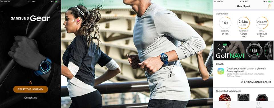 اپلیکیشنی که باید برای اتصال یا هماهنگسازی ساعت و تلفن هوشمند خود نصب کنید، Samsung Gear است که دریافت آن برای کاربران اندرویدی از گوگلپلی و برای کاربران آیفون (در حال حاضر با نام Samsung Gear S) از اپاستور امکانپذیر است. طبیعتا با توجه به محدودیتهای iOS برخی قابلیتها (از جمله انتقال موزیک به ساعت یا پاسخ به پیامکها) برای کاربران آیفون در دسترس نیست؛ ولی با نصب دو اپلیکیشن Samsung Gear S و Samsung Health از اپاستور، میتوان بهسادگی به امکانات اصلی ساعت دسترسی داشت. در قسمت تمرینات ورزشی یا exercise، گزینههای مختلفی از درازنشست و اسکات تا کوهنوردی، دوچرخهسواری و شنا به چشم میخورد. Gear Sport اولین ساعت هوشمند سامسونگ است که از پروفایل ورزش شنا برخوردار است و اطلاعات مختلفی نظیر کالری مصرفی، ضربان قلب و زمان پیمودن هر لپ یا دور را پس از هر بار شنا به شما ارائه میدهد. دو گزینهی جالب دیگر در این اپلیکیشن، «Water tracker» برای اطمینان از آشامیدن میزان مطلوب آب و همچنین «Caffeine tracker» برای کنترل میزان قهوه یا درواقع کافئین مصرفی است.