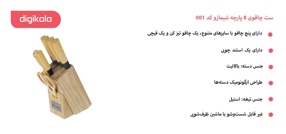 یکی از وسایلی که در آشپزخانه کارایی فراوانی دارد، چاقوست. برای خردکردن انواع موادغذایی نیز به چاقوهای گوناگونی نیاز خواهید داشت. برای رفع این نیاز، ست چاقوی 8 پارچهی «شیمازو» انتخابی خوب به نظر میرسد. این ست شامل سه عدد چاقو، یک ساطور، یک عدد چاقو نان ، یک عدد چاقو تیزکن و یک عدد قیچی آشپزخانه است. برای نگهداری تمام اقلام این ست، میتوان از استند طراحیشده برای آنها استفاده کرد. با قراردادن چاقوها داخل این استند و قراردادنشان در جایی مناسب در آشپزخانه، زیبایی خاصی به این محیط خواهید داد. ناگفته نماند که بدنه یا تیغههای استفادهشده برای چاقوها و ساطور از جنس استیل است که استحکام و پایداری خوبی دارد. در روند ساخت این ست هرکدام از چاقوها برای برش موادغذایی خاص طراحی شدهاند. برای مثال از چاقویی که لبهای دندانهایشکل دارد میتوان برای برشدادن نان بهره برد یا از چاقوهای بزرگ برای برشدادن مرغ و گوشت و... استفاده کرد. قیچی عرضهشده در این ست نیز برای خردکردن موادغذایی گوناگون مناسب است.