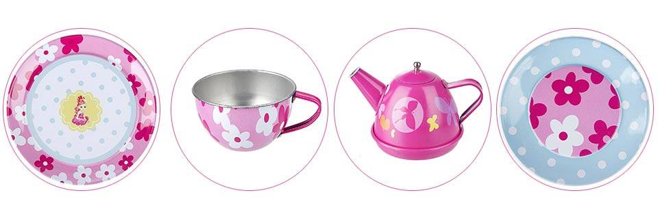 شما میتوانید با این اسباببازی به یاد دوران کودکی خود با کودکتان همراه شده و یک فنجان چای یا قهوه میل کنید و در این میان به کودک خود آموزش پذیرایی از مهمان را بدهید. شایان ذکر است که این وسیله از فلز، با وزنی سبک ساخته شده و هیچگونه آسیبی به کودک دلبند شما نمیرساند و شما میتوانید بعد از هر بار استفاده آن را بشورید. اقلام موجود در این بسته شامل چهارعدد فنجان کوچک، چهارعدد نعلبکی، چهار عدد پیشدستی و یک قوری است.