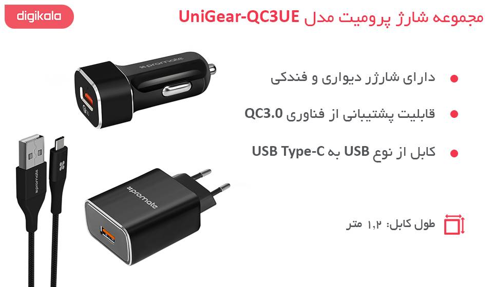 شارژر دیواری پرومیت مدل unigear qc3 ue به همراه شارژر فندکی و کابل تبدیل usb به usb c