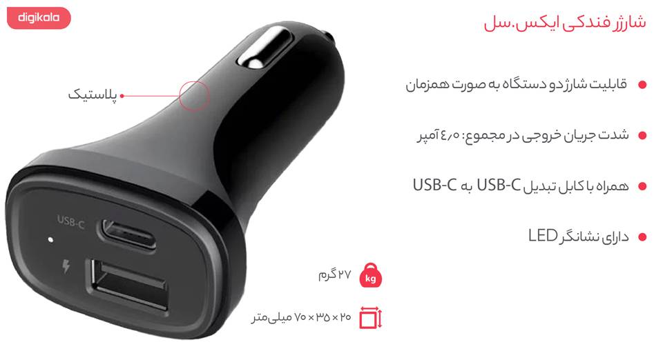 شارژر فندکی CC-490C ایکس.سل (X.Cell) با داشتن دو درگاه خروجی و قابلیت شارژ هم‌زمان دو دستگاه، در وقت شما صرفه‌جویی می‌کند و یک خروجی آن با شدت‌جریان 3.0 آمپر، دستگاه‌ها را سریع‌تر شارژ می‌کند. این خروجی از نوع USB-C است. از ویژگی‌های کاربردی این محصول ایکس.سل تبدیل USB-C آن است که کاربران را از تهیه‌ی کابل بی‌نیاز می‌کند. در این مطلب قصد داریم به بررسی مختصر این شارژر فندکی بپردازیم.