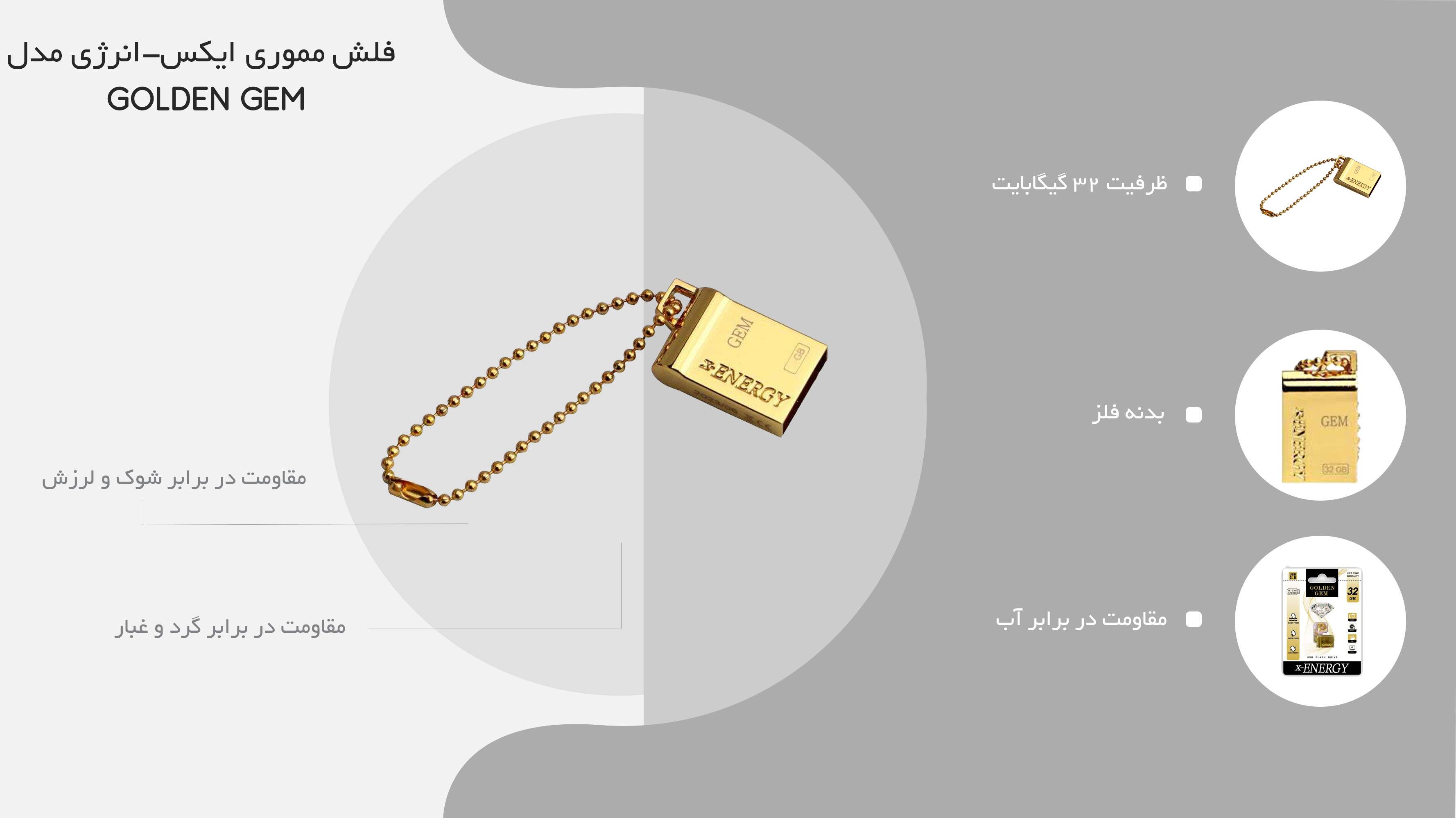 شرکت «ایکس-انرژی» فلش‌مموری «Golden Gem» را که‌از بدنه‌ای مقاوم بهره می‌برد، روانه بازار کرده است. این فلش‌مموری از‌طریق رابط USB3.0 به کامپیوتر متصل می‌شود و می‌تواند اطلاعات را با‌سرعت بالا انتقال دهد. متأسفانه شرکت ایکس-انرژی اطلاعاتی بابت سرعت انتقال اطلاعات توسط این‌محصول ارائه نکرده است. شرکت سازنده در بخش بالایی فلش‌مموری Golden Gem حلقه کوچک و زنجیری برای اتصال فلش‌مموری به جاسوئیچی تعبیه کرده است. این زنجیر می‌تواند احتمال گم‌شدن فلش‌مموری را تا‌حد زیادی کاهش دهد. ظرفیت این‌ فلش‌مموری 32 گیگابایت بوده که با‌توجه به میزان اطلاعاتی که نیاز‌به ذخیره‌سازی دارید می‌توانید از آن‌ استفاده کنید. این فلش‌مموری با سیستم‌عامل‌های مک و ویندوز به‌خوبی سازگار است. گفتنی است این‌محصول دربرابر آب، ضربه، شوک و گردوغبار مقاوم است. ایکس-انرژی در طراحی این ‌محصول از رنگ طلایی یک‌دست استفاده کرده که جذابیت ظاهری آن‌را بیشتر کرده است. گفتنی است که فلش مموری ایکس-انرژی مدل GOLDEN GEM ظرفیت 32 گیگابایت ضد اثر انگشت و لک است.