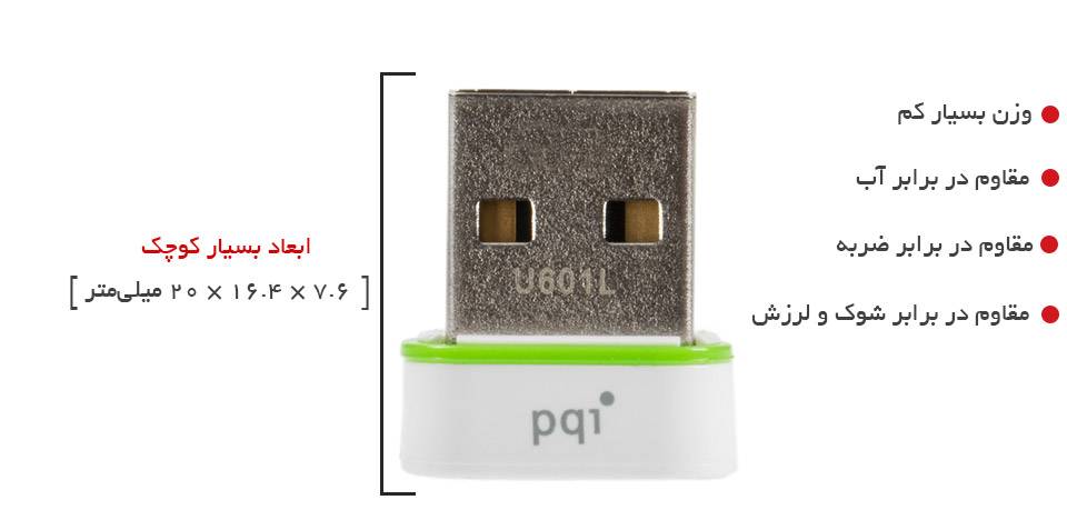 «U601L» تولید کمپانی «pqi» یک فلش‌مموری بسیار کوچک و سبک‌وزن با طراحی بسیار زیباست. وزن این فلش‌مموری تنها 3 گرم و ابعاد آن 0.76×1.64×1.99 سانتی‌متر است؛ بنابراین یک دستگاه ذخیره‌سازی فوق‌العاده جمع‌وجور و سبک‌وزن محسوب می‌شود که می‌تواند تمامی اطلاعات شما را به‌راحتی قابل‌حمل کند؛ همچنین به شما این امکان را می‌دهد که اطلاعات خود را همیشه و همه جا به همراه داشته باشید. این فلش‌مموری برای استفاده در دستگاه‌های ظریفی مانند الترابوک‌ها، لپ‌تاپ‌های بسیار نازک، پخش خودرو و... مناسب است؛ زیرا هنگامی‌که U601L را به این محصولات متصل می‌کنید، شکل ظاهری ظریف آن‌ها به هم نمی‌ریزد. این فلش‌مموری برای اتصال به محصولاتی هم که رابط USB آن‌ها با یکدیگر فاصله‌ی نزدیکی دارند، مناسب است؛ زیرا اتصال فلش‌مموری‌هایی که ابعاد بزرگی دارند، یا امکان دسترسی به رابط USB کناری را به صورت کامل از بین می‌برد، یا اتصال یک محصول دیگر به رابط USB کناری را بسیار مشکل می‌کند؛ ولی وقتی این محصول را به رابط USB یک دستگاه متصل کنید، مقدار کمی از بدنه‌ی محصول بیرون می‌ماند و به شما این امکان را می‌دهد که به رابط USB دیگری هم که در کنار رابط USB قرار دارد و فلش به آن متصل است، به صورت کامل و به‌راحتی دسترسی داشته باشید؛ همچنین شما را قادر می‌سازد، لپ‌تاپ یا تبلت خود را بدون نیاز به جداکردن فلش‌مموری از آن، در کیف خود قرار دهید و به‌راحتی آن‌ها را با خود حمل کنید.